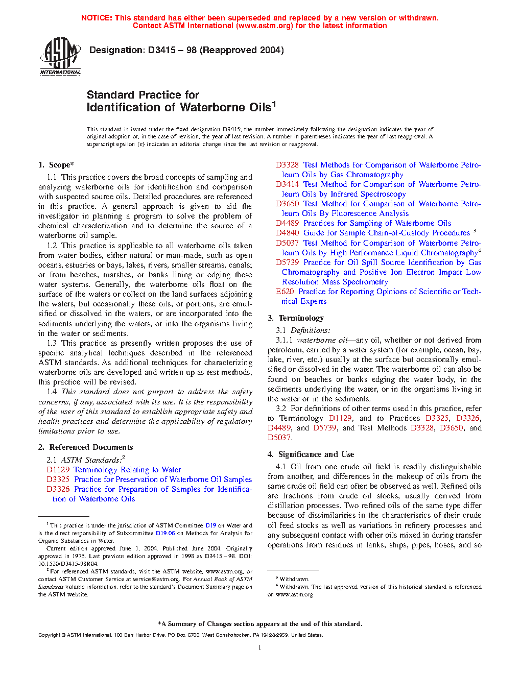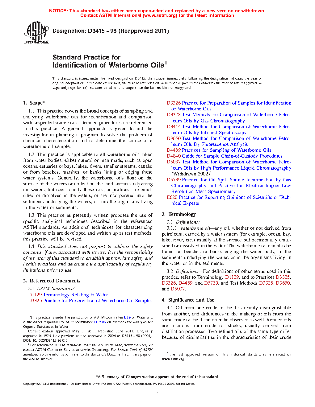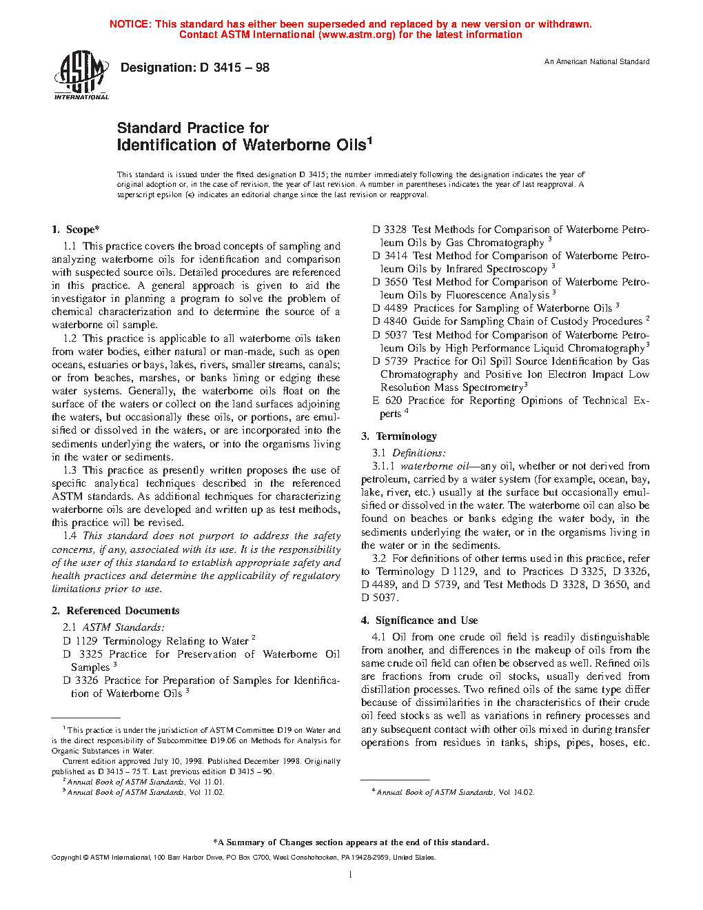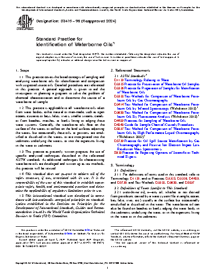 1.3 This practice as presently written proposes the use of specific analytical techniques described in the referenced ASTM standards. As additional techniques for characterizing waterborne oils are developed and written up as test methods, this practice will be revised.