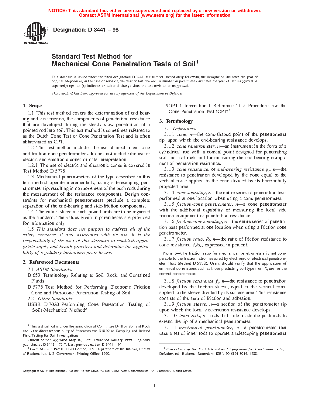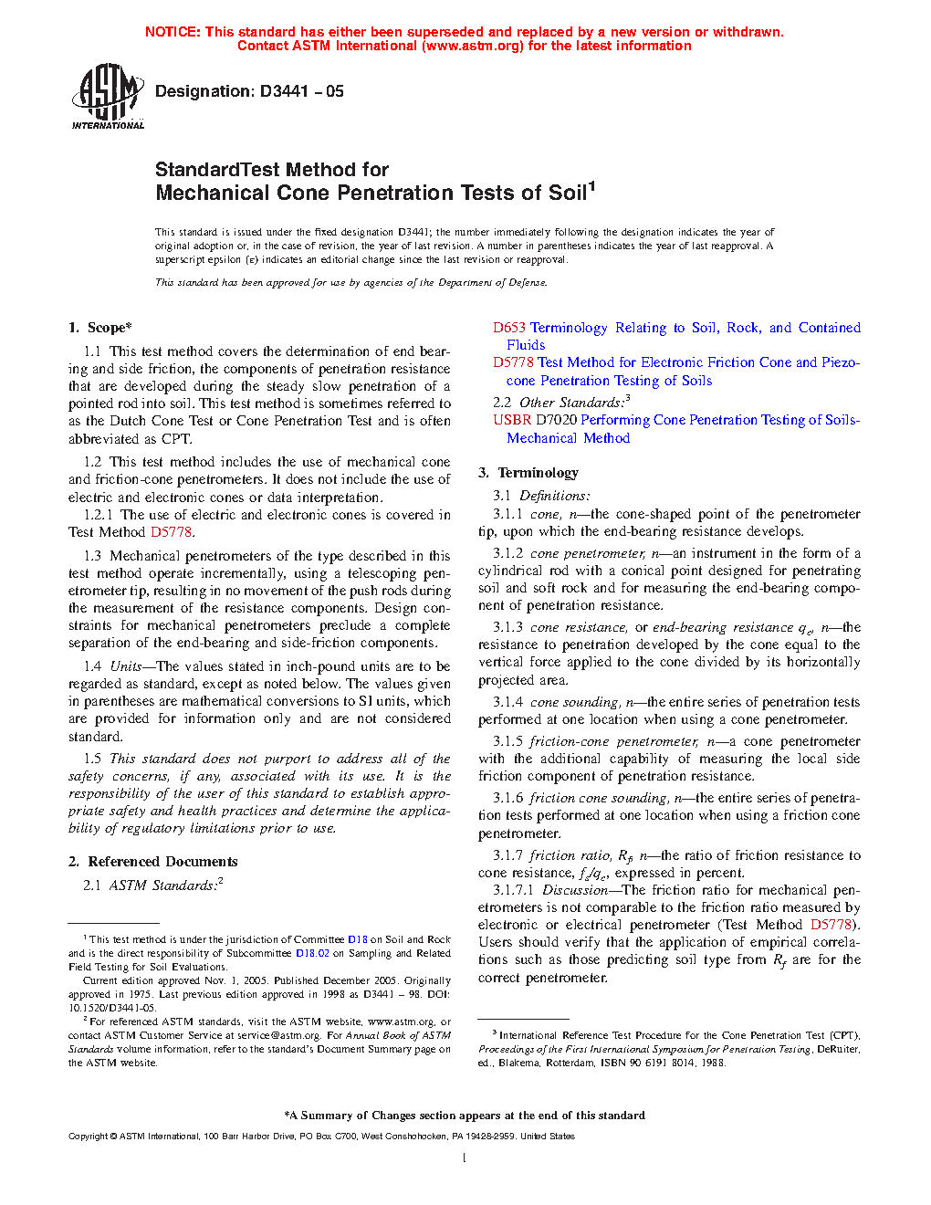 4.4.1 Cone test data from the mechanical cone (D3441) are generally comparable with the electronic cone (D5778) but there are differences because of the geometry of the cone and friction sleeve sections. Users of these test data are cautioned that engineering correlations from electronic cones should not be used for these mechanical cones. Users should verify that the application of empirical correlations such as those predicting soil types from Rf are for the correct penetrometer.3