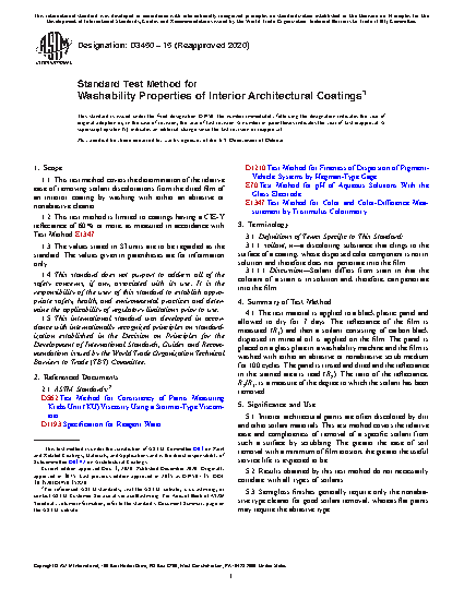1.1 This test method covers the determination of the relative ease of removing soilant discolorations from the dried film of an interior coating by washing with either an abrasive or nonabrasive cleaner.