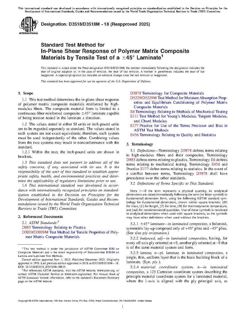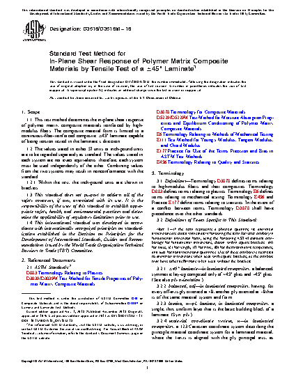 1.1 This practice determines the in-plane shear response of polymer matrix composite materials reinforced by high-modulus fibers. The composite material form is limited to a continuous-fiber reinforced composite +45° laminate capable of being tension tested in the laminate chi-direction.