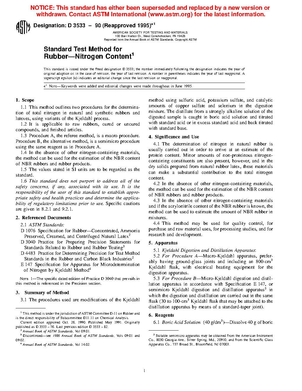 1.1 This test method outlines two procedures for the determination of total nitrogen in natural and synthetic rubbers and latexes, using variants of the Kjeldahl process.