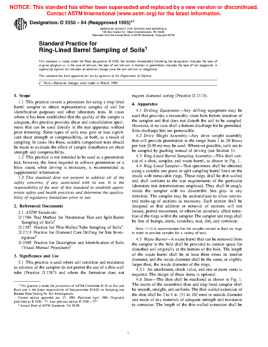 1.1 This practice covers procedure for thick wall, split barrel drive sampling of soil to obtain representative samples of soil for classification and laboratory testing. The sampler is considered to be a thick wall sampler with sharpened cutting shoe and ball check vent. The middle barrel section is often of split barrel design, but a solid barrel can be used and both may contain ring liners. The sampler is often driven, but can also be pushed in softer deposits. Penetration resistance data may be recorded. This standard uses procedures similar to Test Method D1586 on Penetration Resistance and Split Barrel Sampling of Soils. However, in this practice, differing hammer weights, drop heights, and different size samplers are used, so the data must not be reported as conforming to Test Method D1586 and cannot be used to determine Normalized penetration resistance data for sands in accordance with Practice D6066.