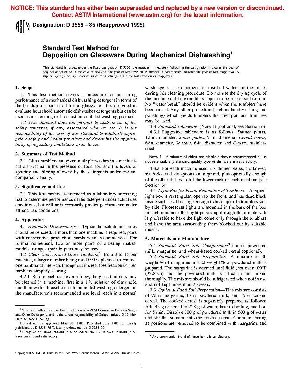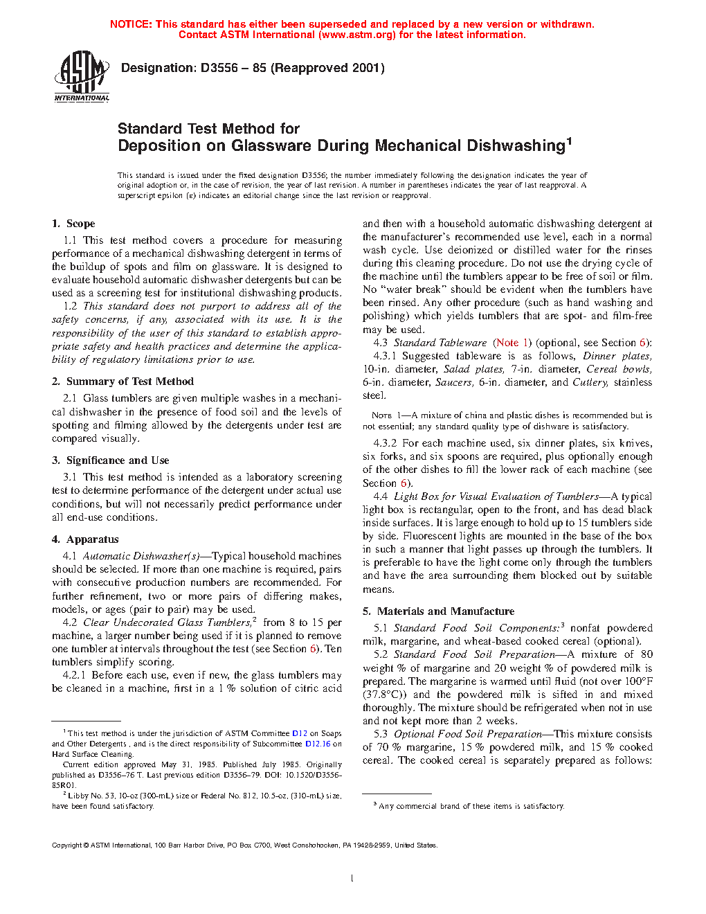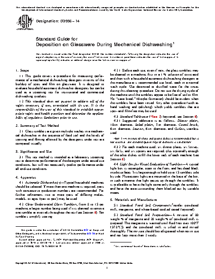 1.1 This test method covers a procedure for measuring performance of a mechanical dishwashing detergent in terms of the buildup of spots and film on glassware. It is designed to evaluate household automatic dishwasher detergents but can be used as a screening test for institutional dishwashing products.