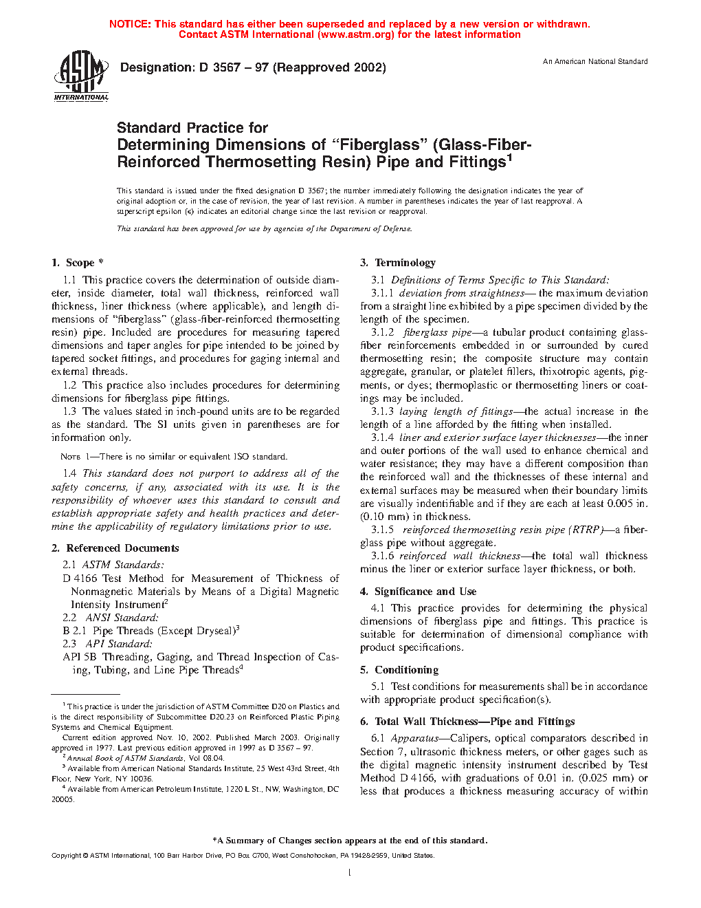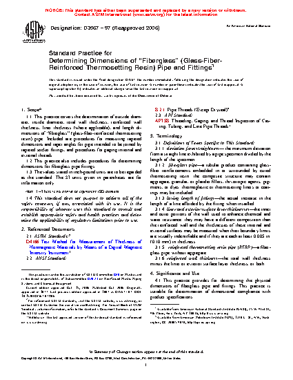 1.1 This practice covers the determination of outside diameter, inside diameter, total wall thickness, reinforced wall thickness, liner thickness (where applicable), and length dimensions of "fiberglass" (glass-fiber-reinforced thermosetting resin) pipe. Included are procedures for measuring tapered dimensions and taper angles for pipe intended to be joined by tapered socket fittings, and procedures for gaging internal and external threads.