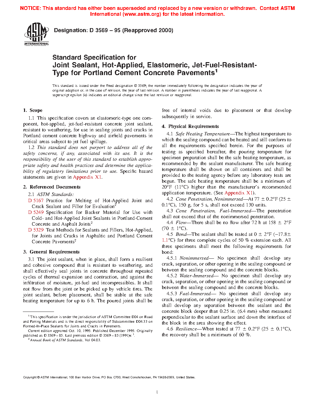 1.1 This specification covers an elastomeric-type one component, hot-applied, jet-fuel-resistant concrete joint sealant, resistant to weathering, for use in sealing joints and cracks in Portland cement concrete highway and airfield pavements in critical areas subject to jet fuel spillage.