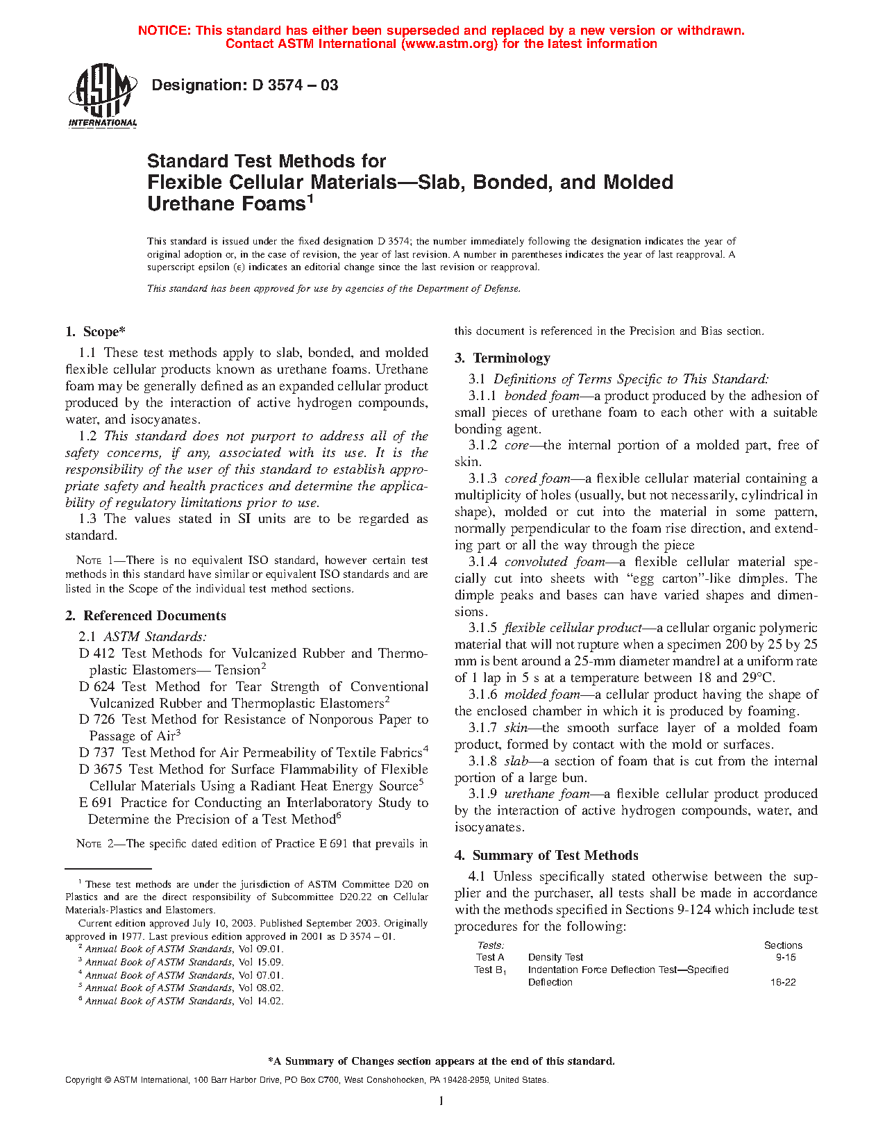 Standard Methods of Testing Flexible Cellular Materials-Slab, Bonded, And Molded Urethane Foams
