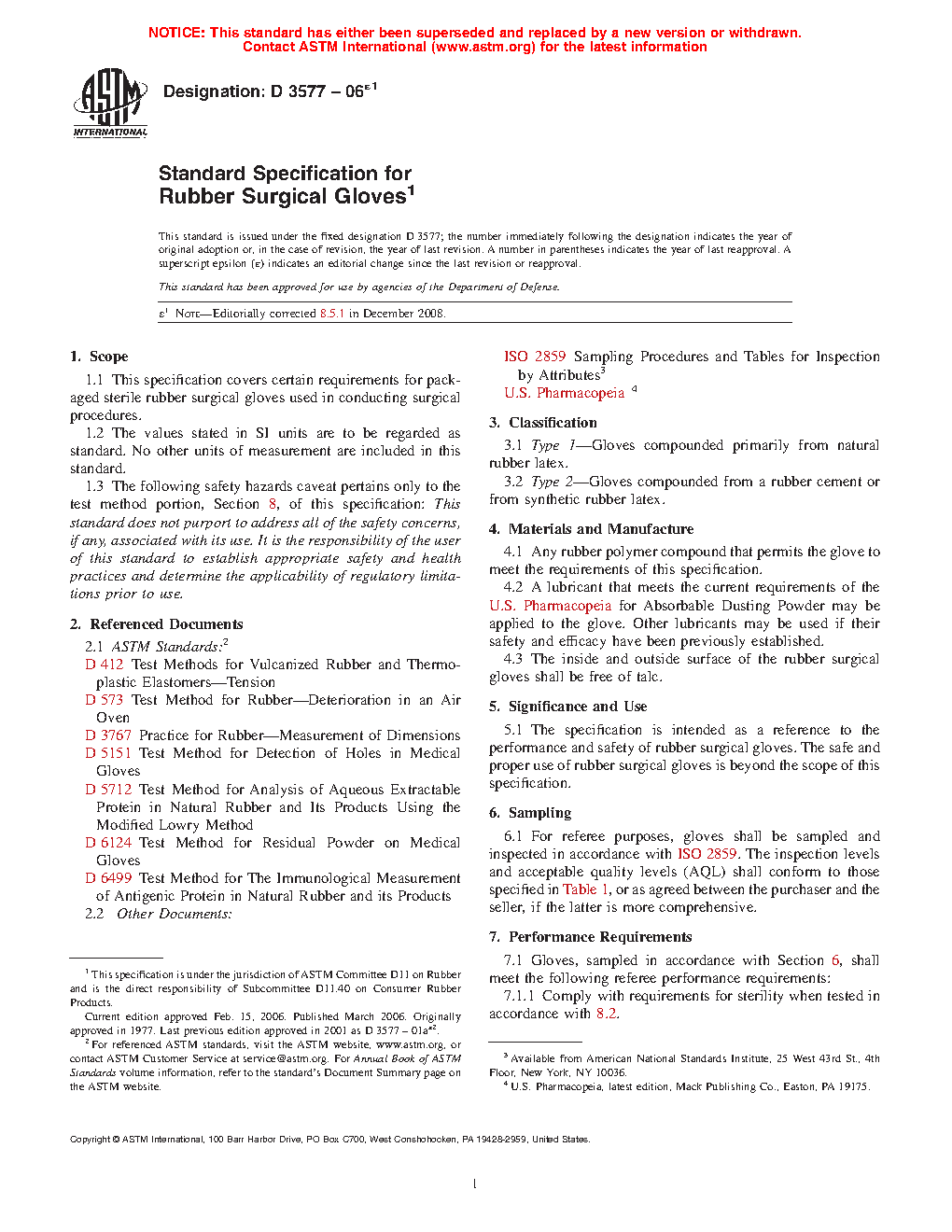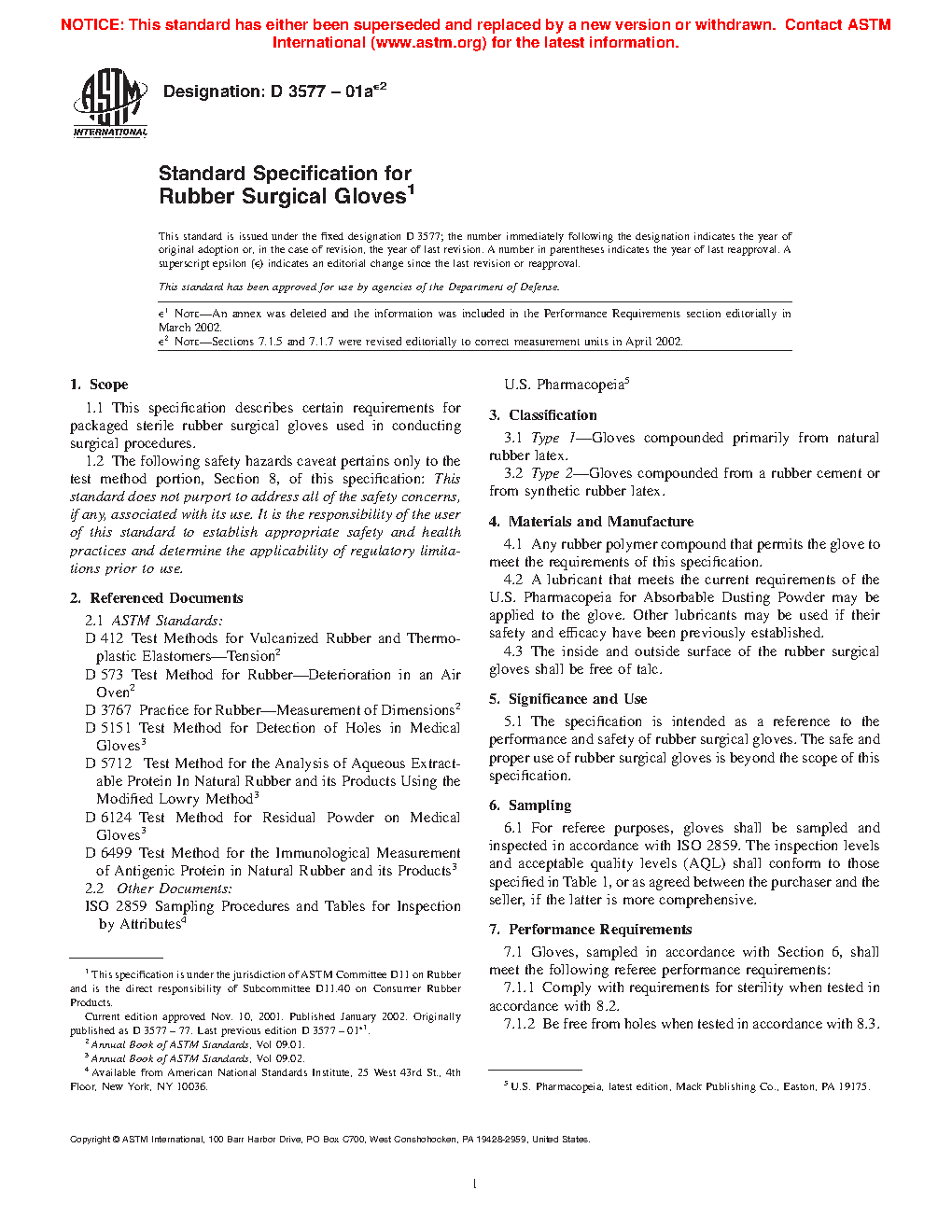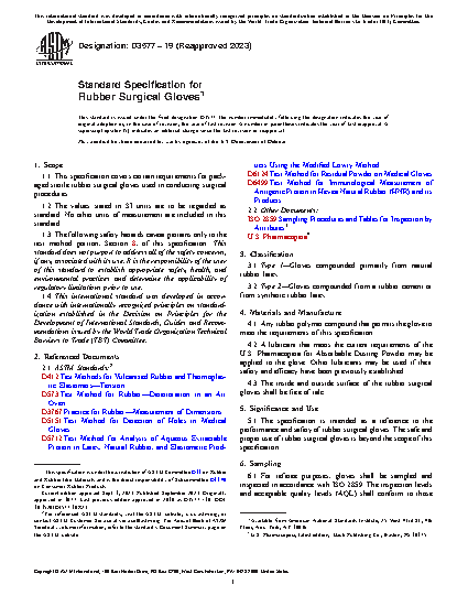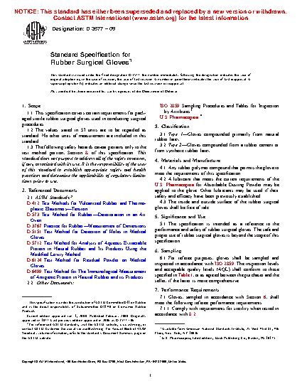 1.1 This specification covers certain requirements for packaged sterile rubber surgical gloves used in conducting surgical procedures.
