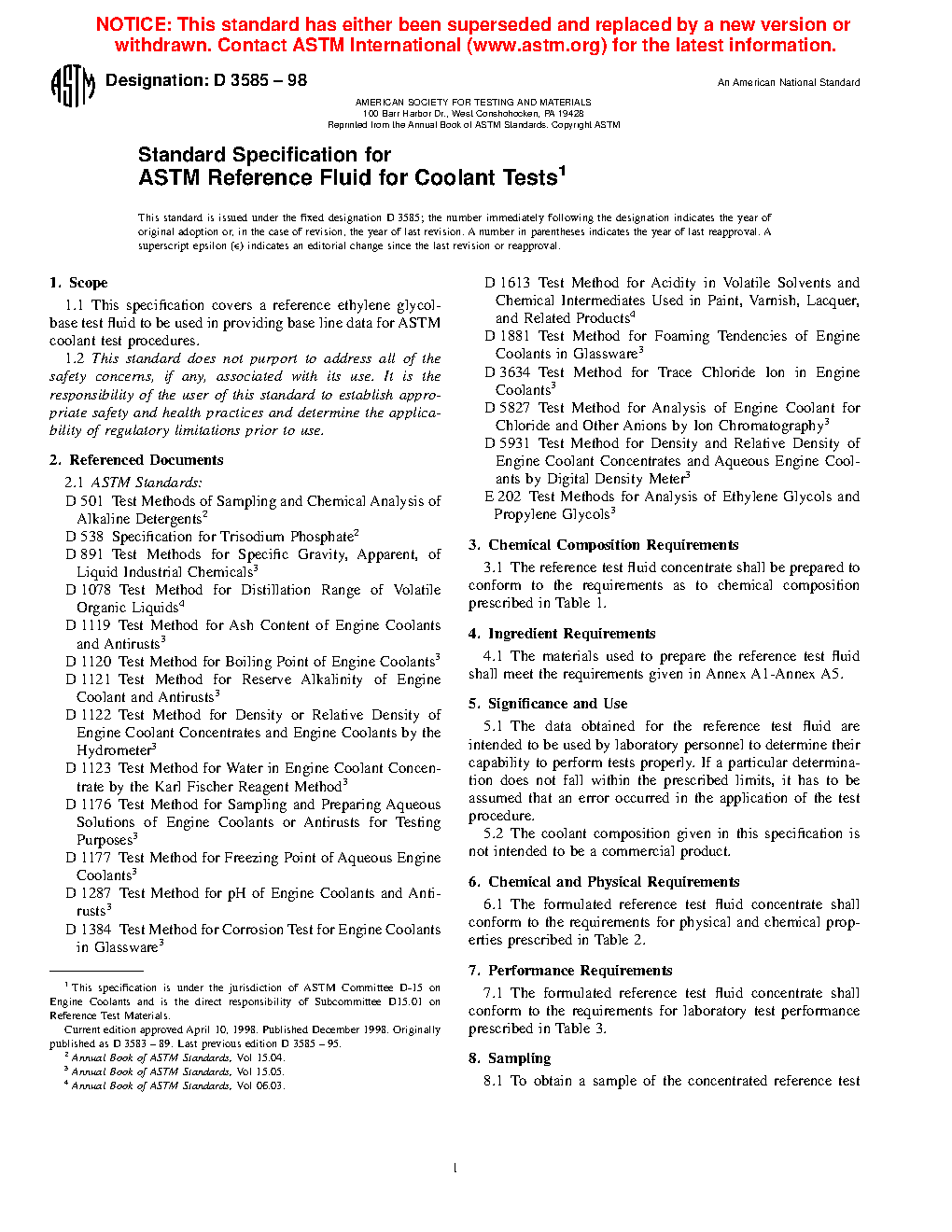 This specification covers a reference ethylene glycol-base test fluid to be used in providing base line data for ASTM coolant test procedures. The reference test fluid concentrate shall be prepared to conform to the requirements as to chemical composition prescribed. The materials used to prepare the reference test fluid shall meet the requirements specified. The formulated reference test fluid concentrate shall conform to the requirements for laboratory test performance prescribed.