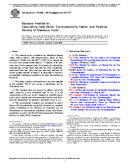 1.1 This practice covers procedures for calculating heating value, relative density, and compressibility factor at base conditions (14.696 psia and 60°F (15.6°C)) for natural gas mixtures from compositional analysis.2 It applies to all common types of utility gaseous fuels, for example, dry natural gas, reformed gas, oil gas (both high and low Btu), propane-air, carbureted water gas, coke oven gas, and retort coal gas, for which suitable methods of analysis as described in Section 6 are available. Calculation procedures for other base conditions are given.