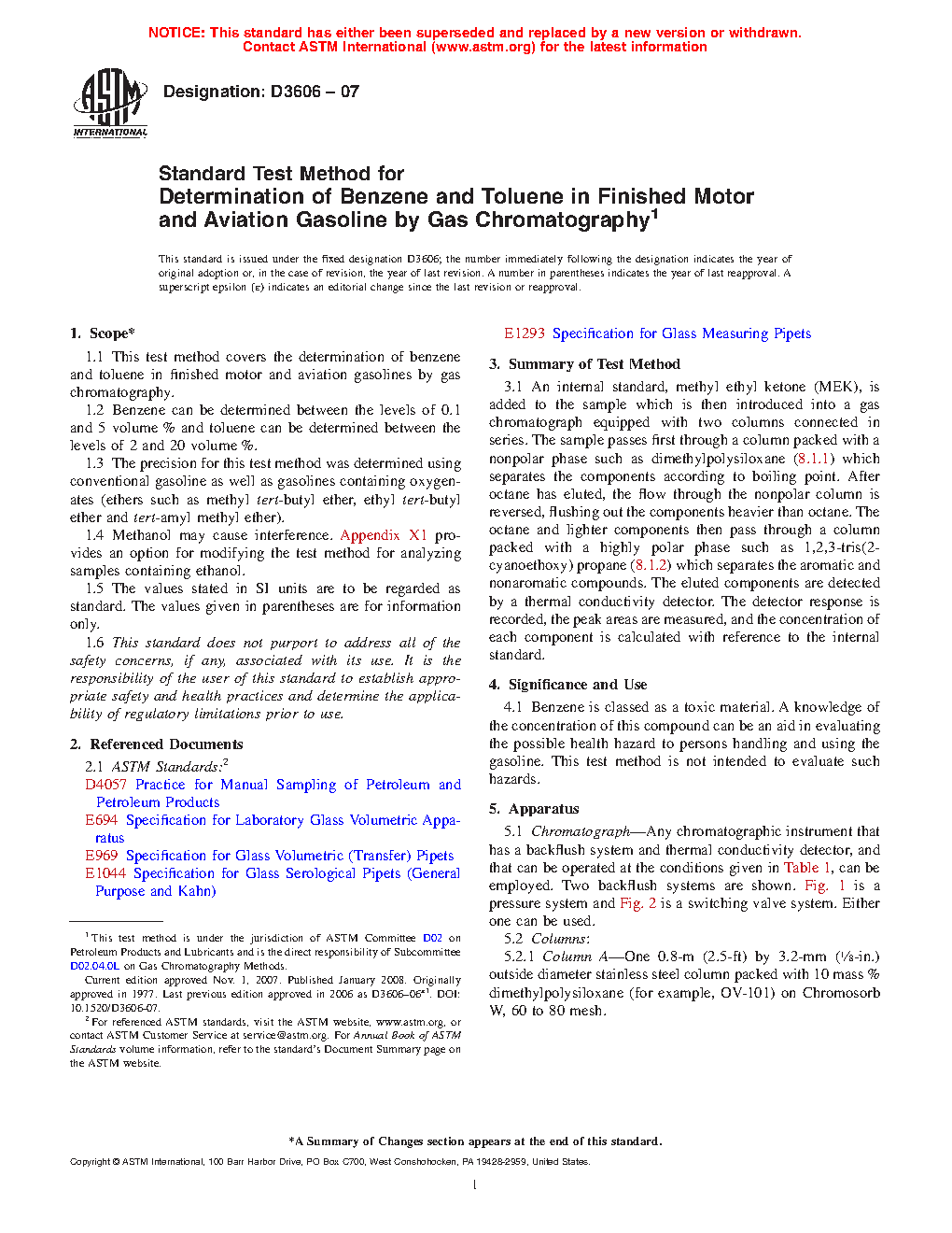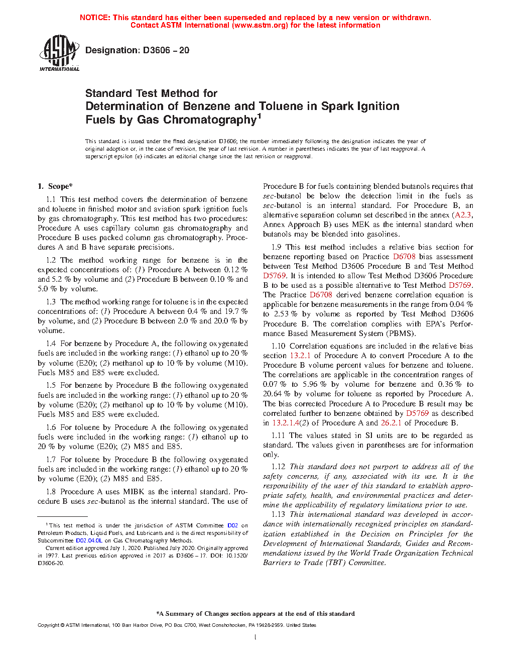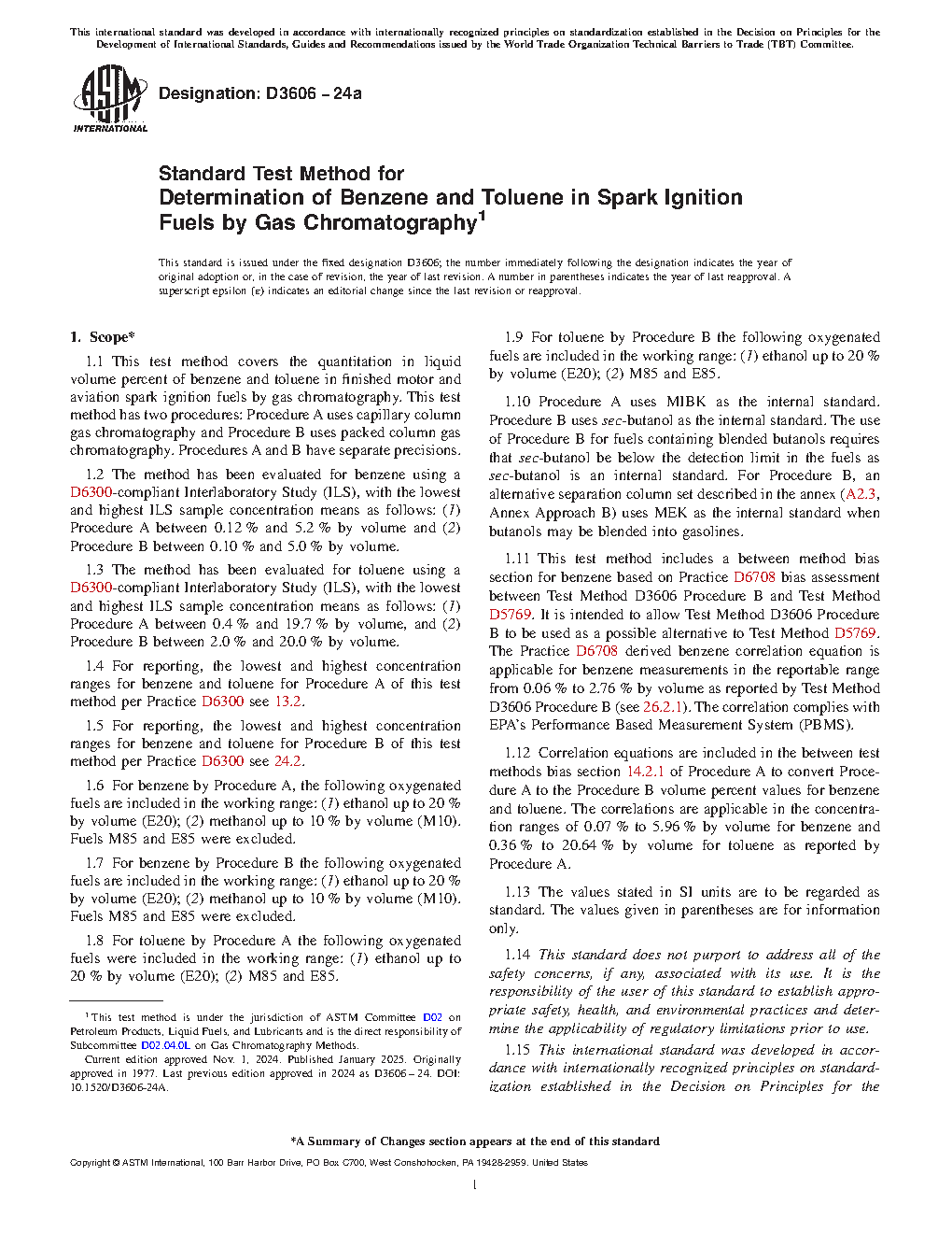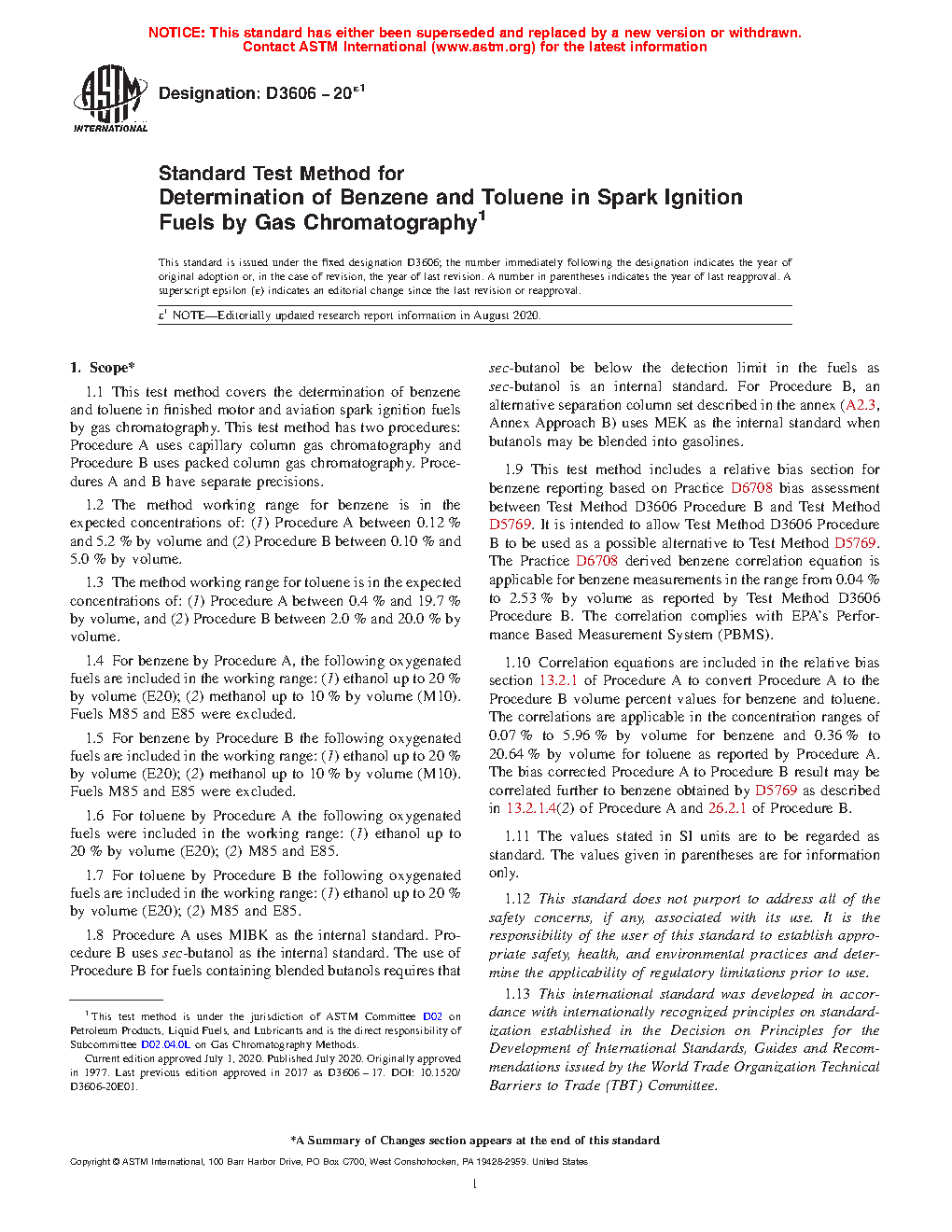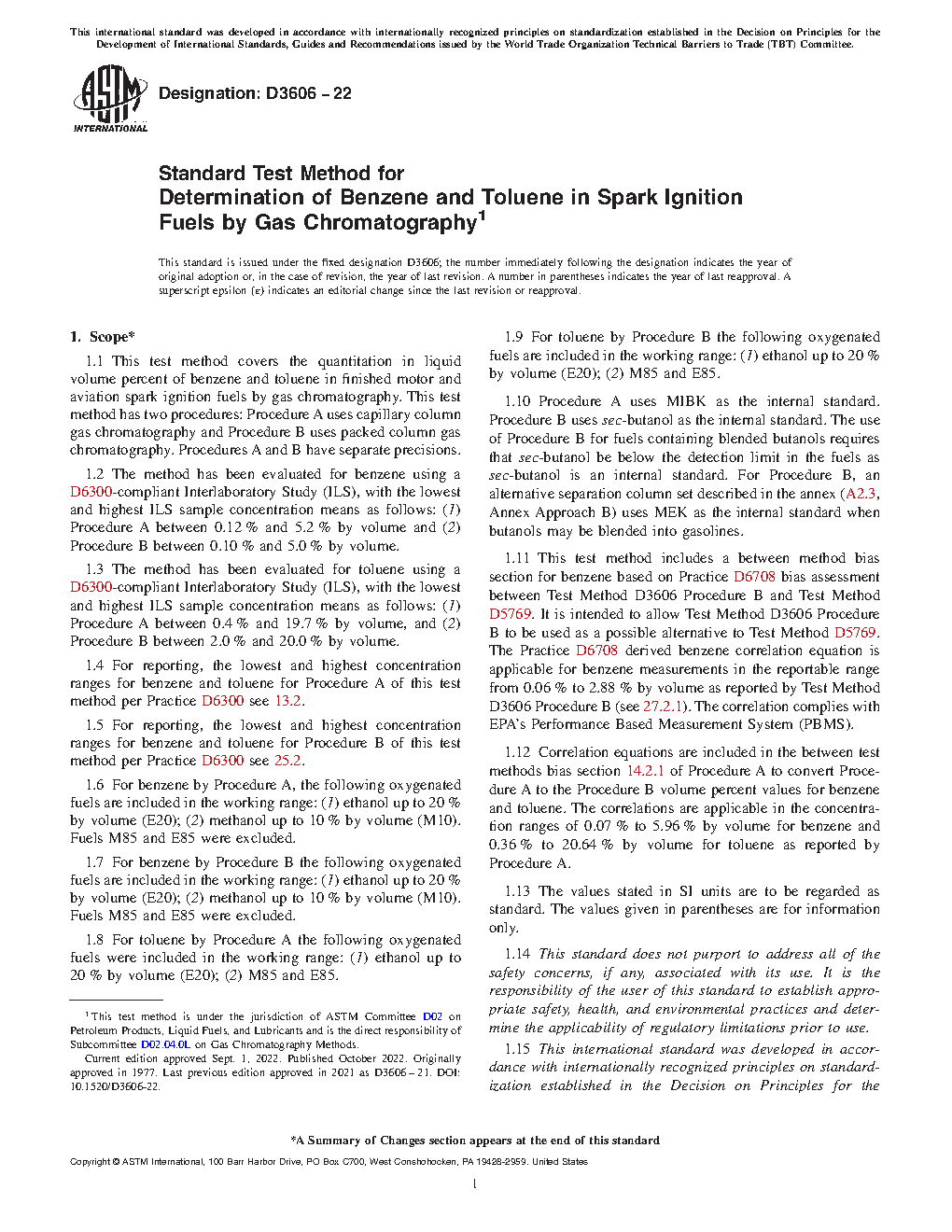 1.1 This test method covers the determination of benzene and toluene in finished motor and aviation spark ignition fuels by gas chromatography. This test method has two procedures: Procedure A uses capillary column gas chromatography and Procedure B uses packed gas chromatography columns. Procedures A and B have separate precisions.