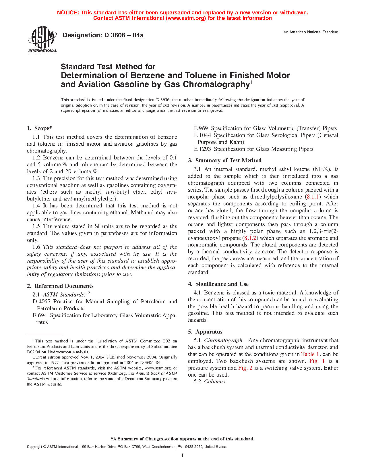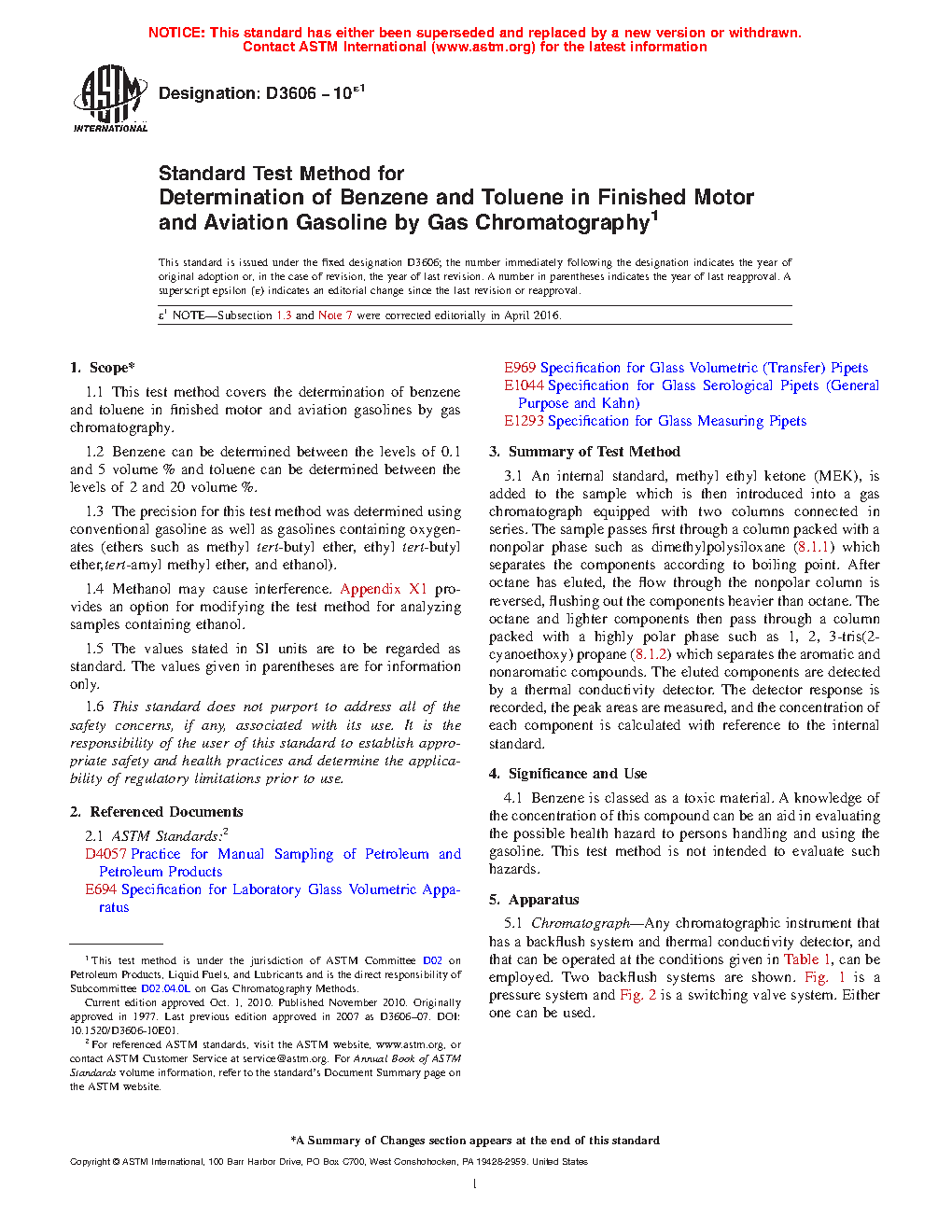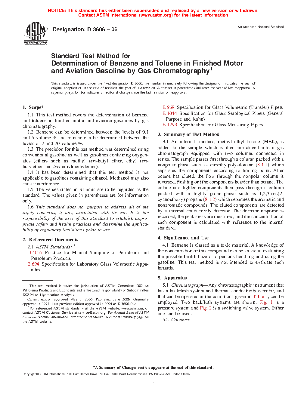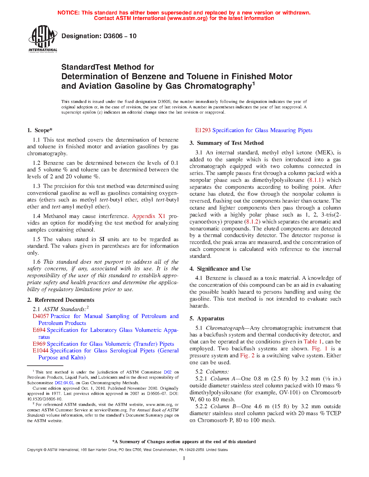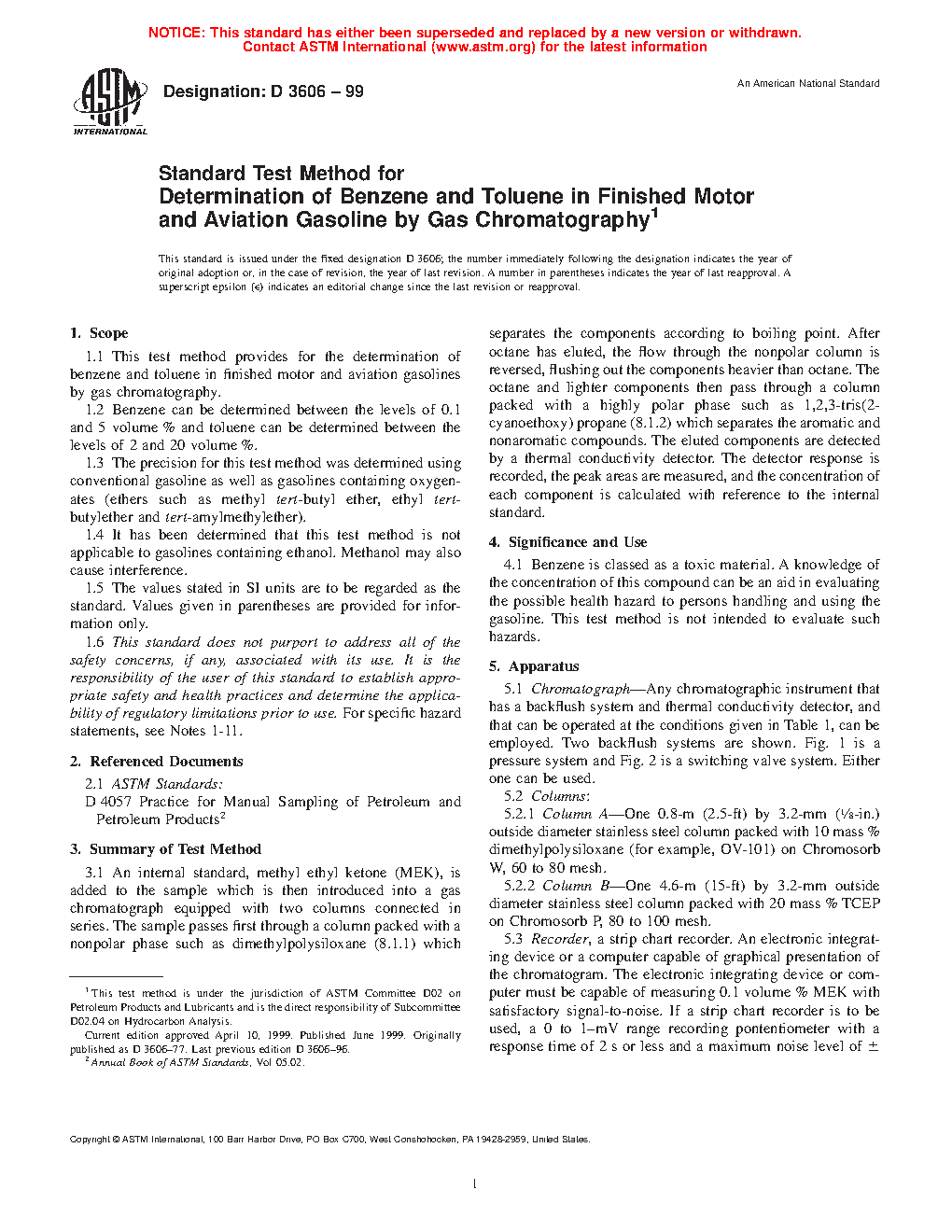 1.1 This test method covers the determination of benzene and toluene in finished motor and aviation spark ignition fuels by gas chromatography. This test method has two procedures: Procedure A uses capillary column gas chromatography and Procedure B uses packed gas chromatography columns. Procedures A and B have separate precisions.