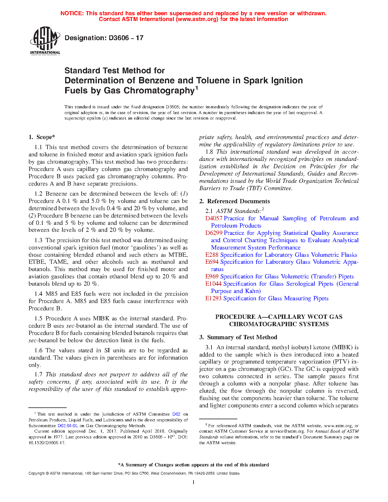 1.5 Procedure A uses MIBK as the internal standard. Procedure B uses sec-butanol as the internal standard. The use of Procedure B for fuels containing blended butanols requires that sec-butanol be below the detection limit in the fuels.