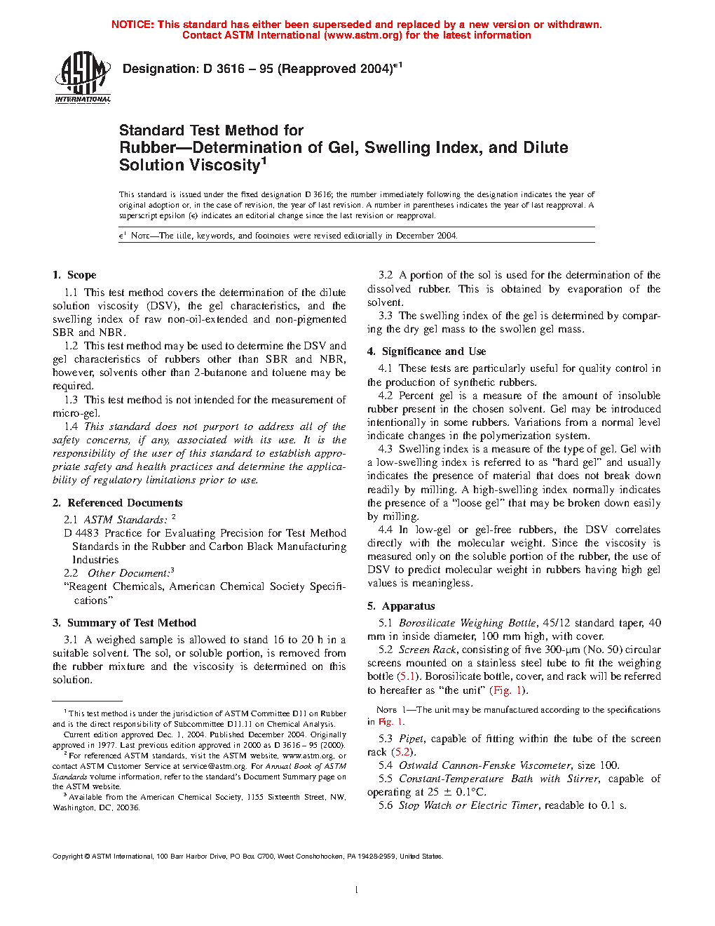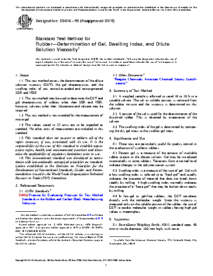 1.1 This test method covers the determination of the dilute solution viscosity (DSV), the gel characteristics, and the swelling index of raw non-oil-extended and non-pigmented SBR and NBR.