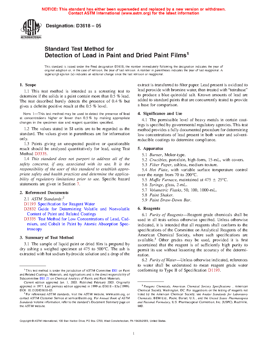 The permissible level of heavy metals in certain coatings is specified by governmental regulatory agencies. This test method provides a fully documented procedure for determining low concentrations of lead present in both water and solvent-reducible coatings to determine compliance.