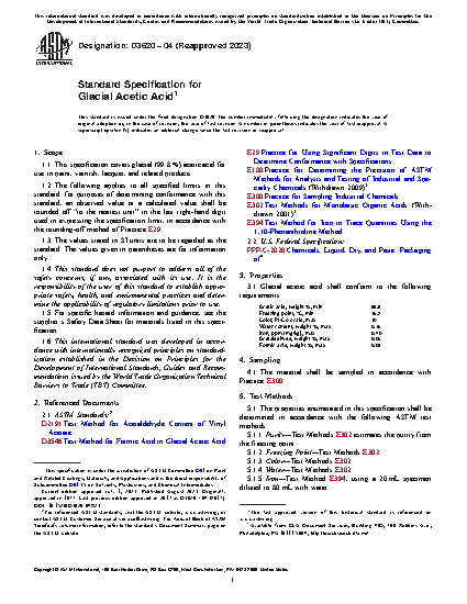 1.1 This specification covers glacial (99.8 %) acetic acid for use in paint, varnish, lacquer, and related products.