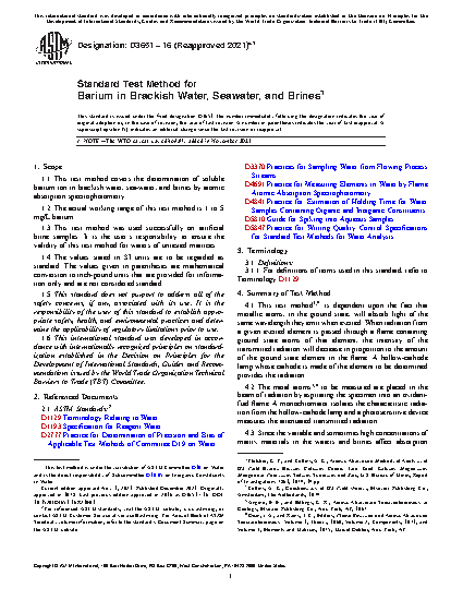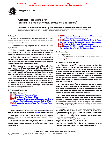 1.1 This test method covers the determination of soluble barium ion in brackish water, sea-water, and brines by atomic absorption spectrophotometry.