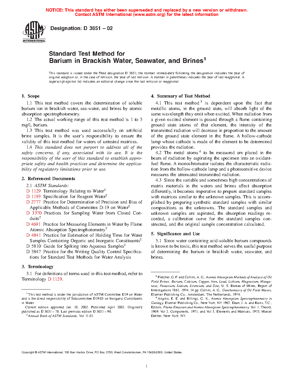 5.1 Since water containing acid-soluble barium compounds is known to be toxic, this test method serves the useful purpose of determining the barium in brackish water, seawater, and brines.