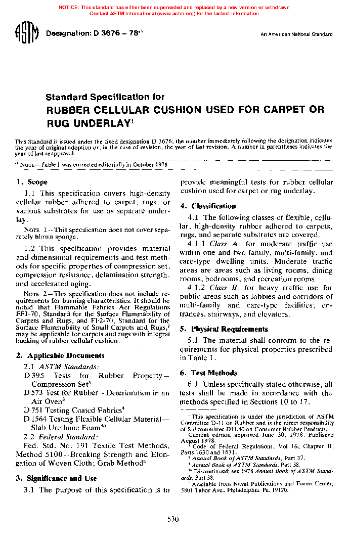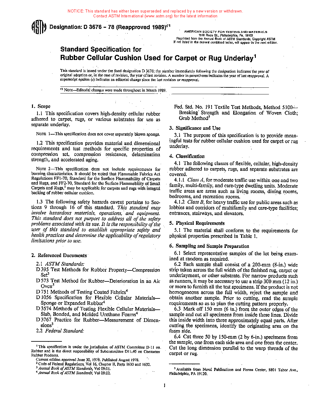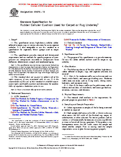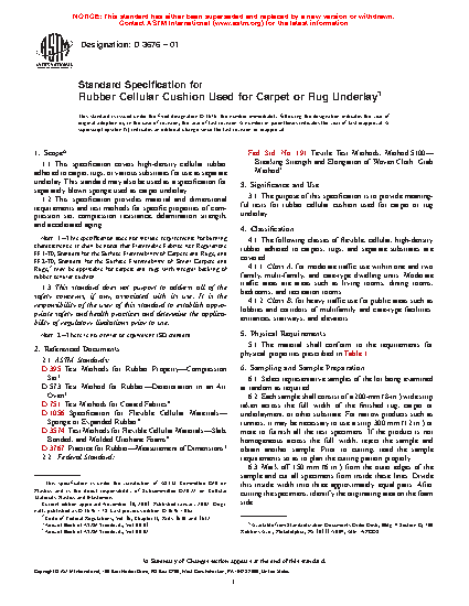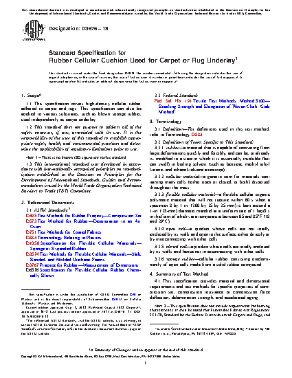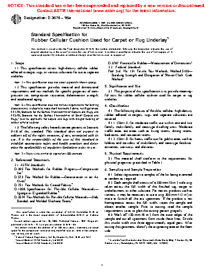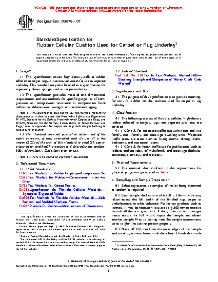 Standard Specification for Rubber Cellular Cushion Used For Carpet Or Rug Underlay