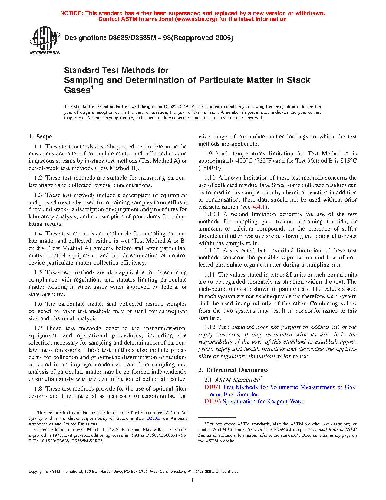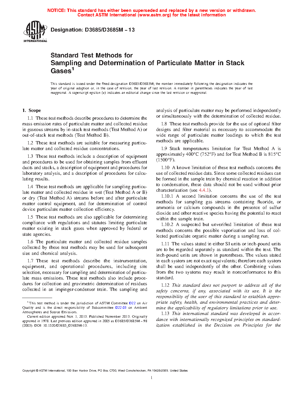 Standard Test Methods for Sampling and Determination of Particulate Matter in Stack Gases