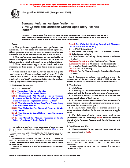 1.1 This specification covers performance requirements for vinyl-coated and urethane-coated upholstery fabrics produced with woven, knit, or nonwoven substrates which are used in the manufacture of new indoor furniture.