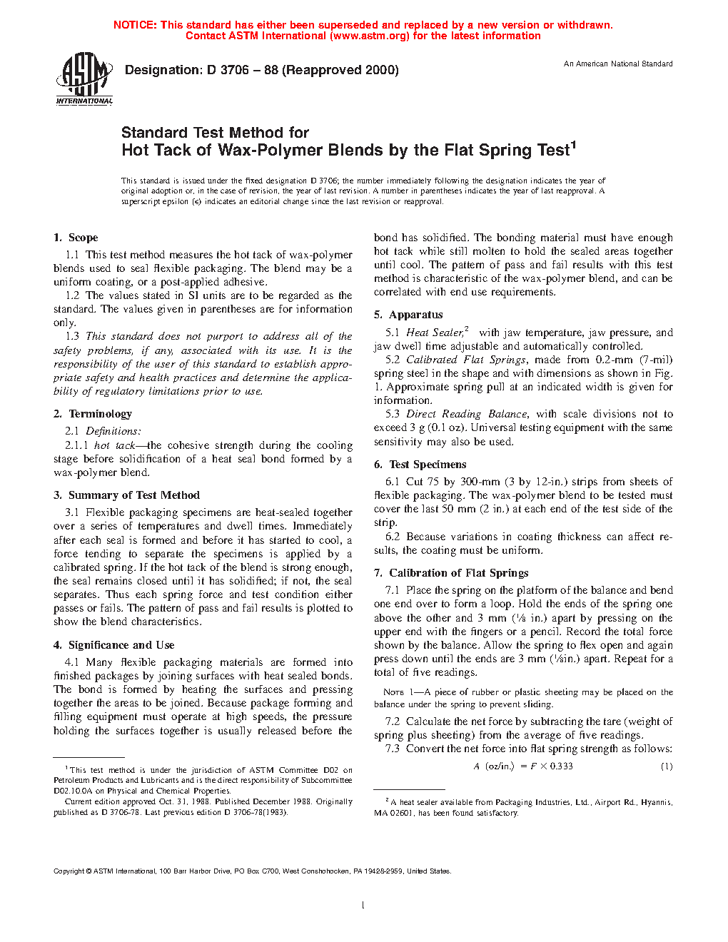 1.1 This test method measures the hot tack of wax-polymer blends used to seal flexible packaging. The blend may be a uniform coating, or a post-applied adhesive.