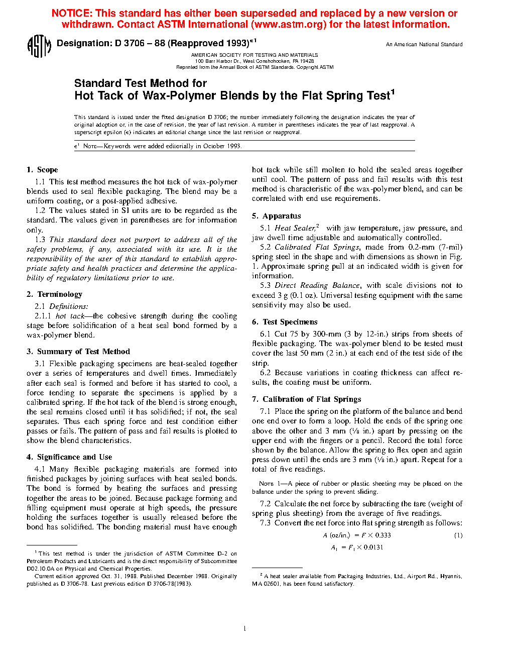 Standard Test Method for Hot Tack of Wax-Polymer Blends by the Flat Spring Test (Withdrawn 2004)
