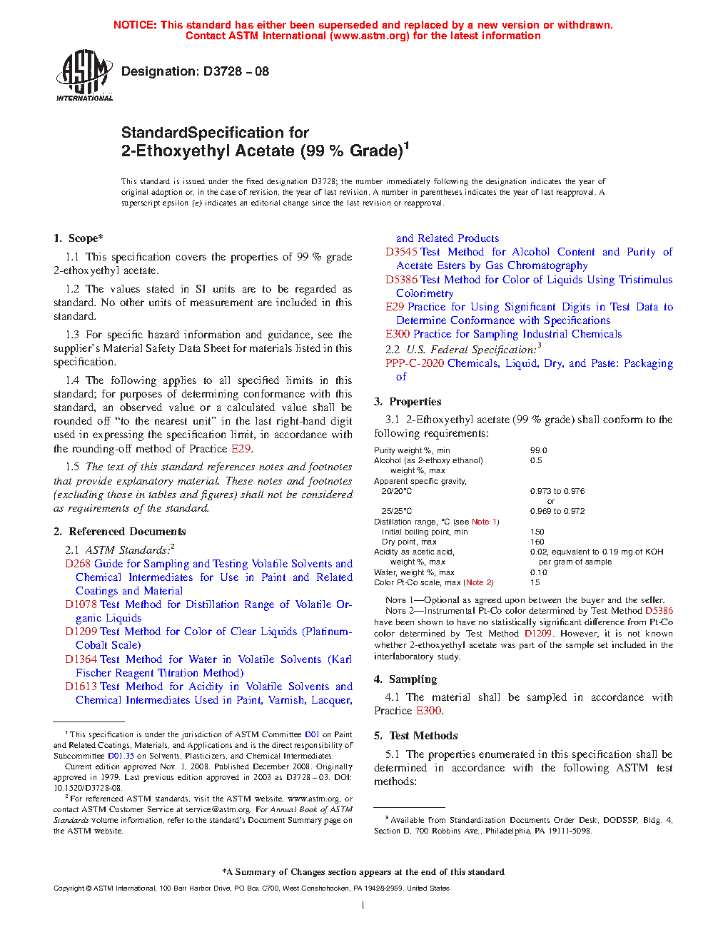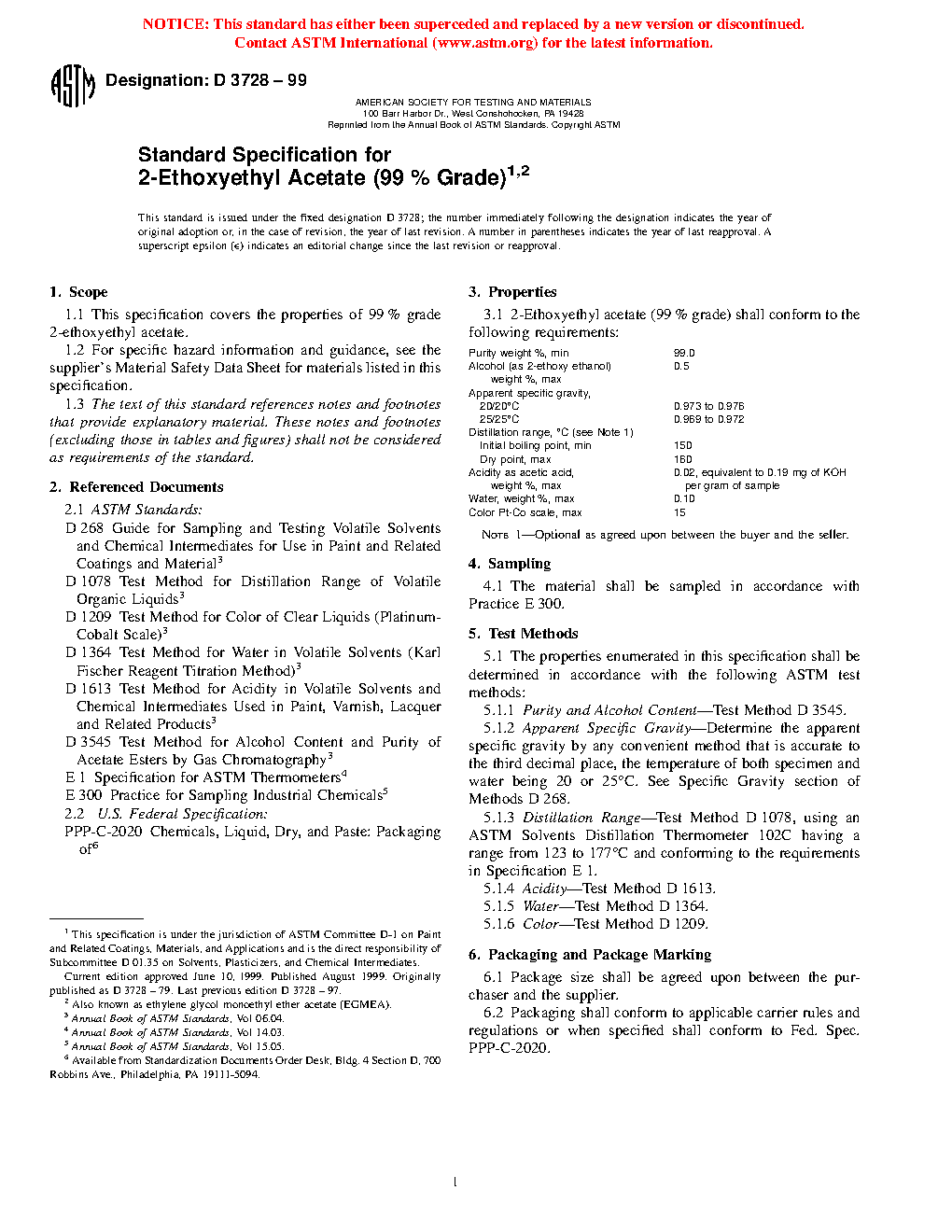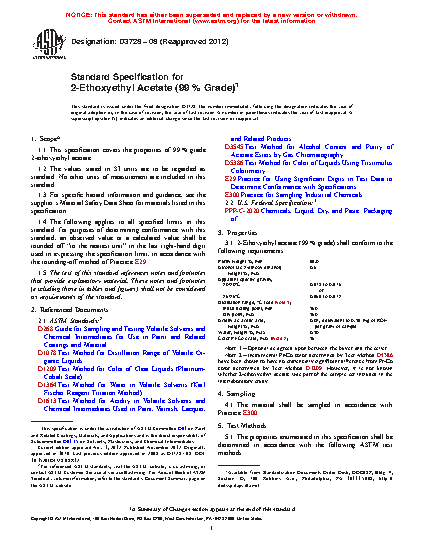 This specification establishes the properties and requirements for 99 % grade 2-ethoxyethyl acetate. The specimens shall be adequately sampled and undergo chemical analysis, and shall adhere accordingly to chemical property requirements as to purity, alcohol content, color (Pt-Co scale), water content, distillation range (initial boiling and dry points), acidity as acetic acid, and apparent specific gravity.