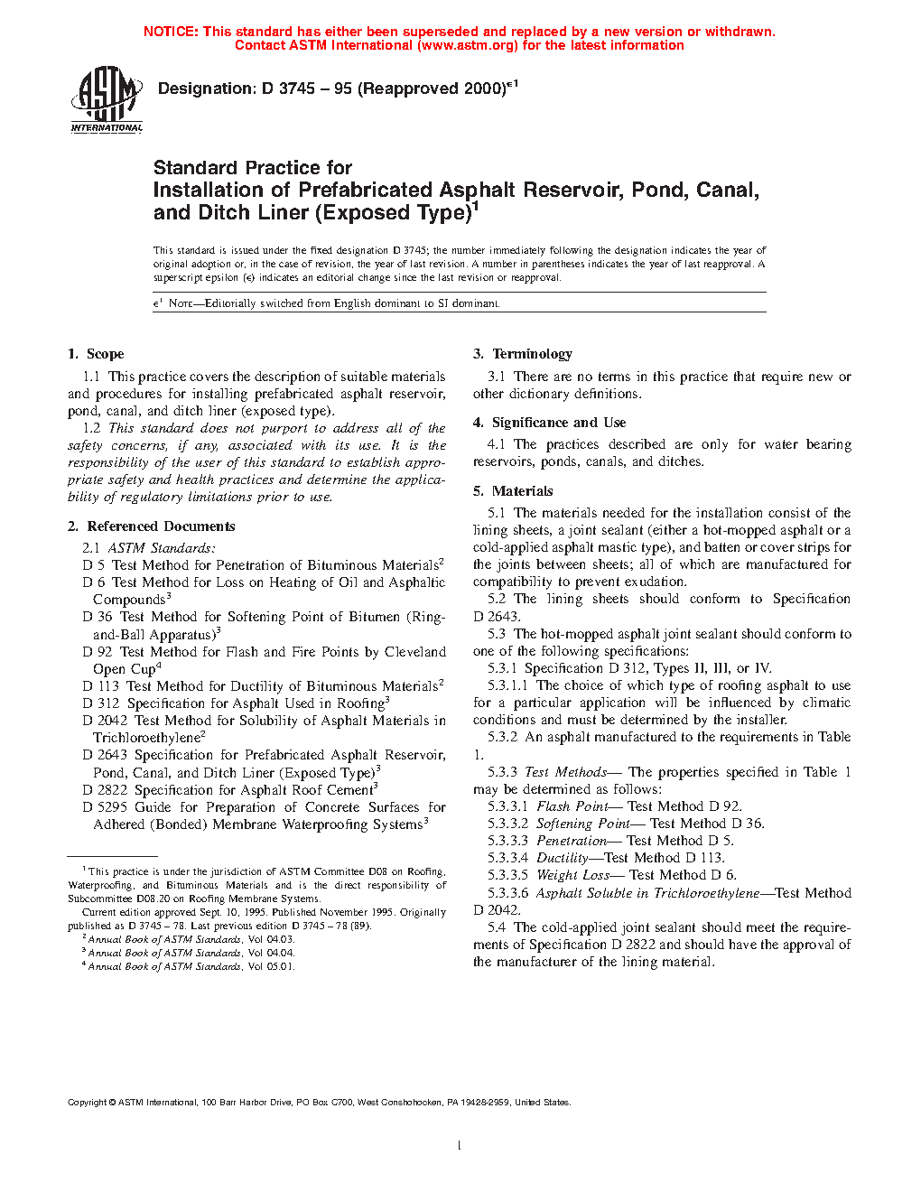 1.1 This practice covers the description of suitable materials and procedures for installing prefabricated asphalt reservoir, pond, canal, and ditch liner (exposed type).