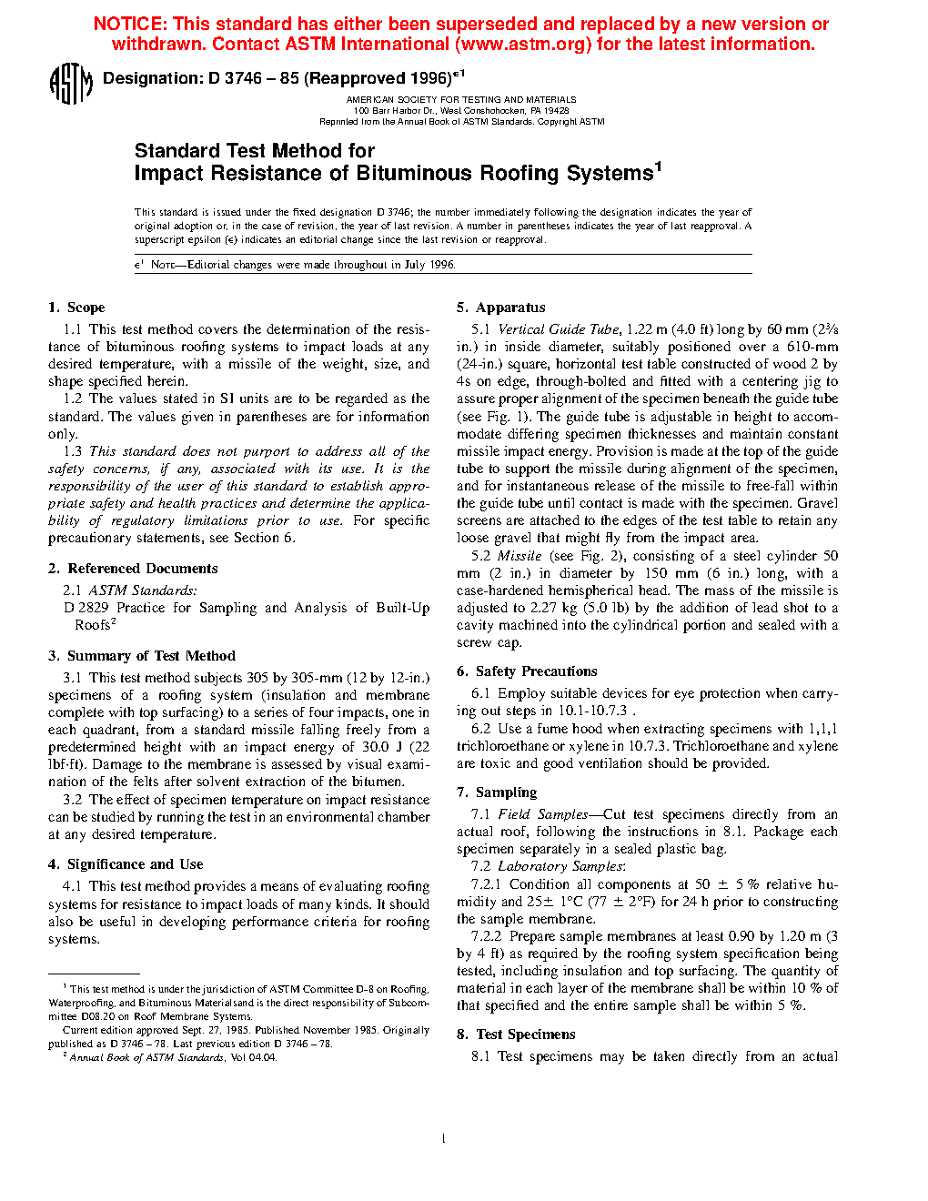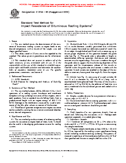 This test method provides a means of evaluating roofing systems for resistance to impact loads of many kinds. It should also be useful in developing performance criteria for roofing systems.