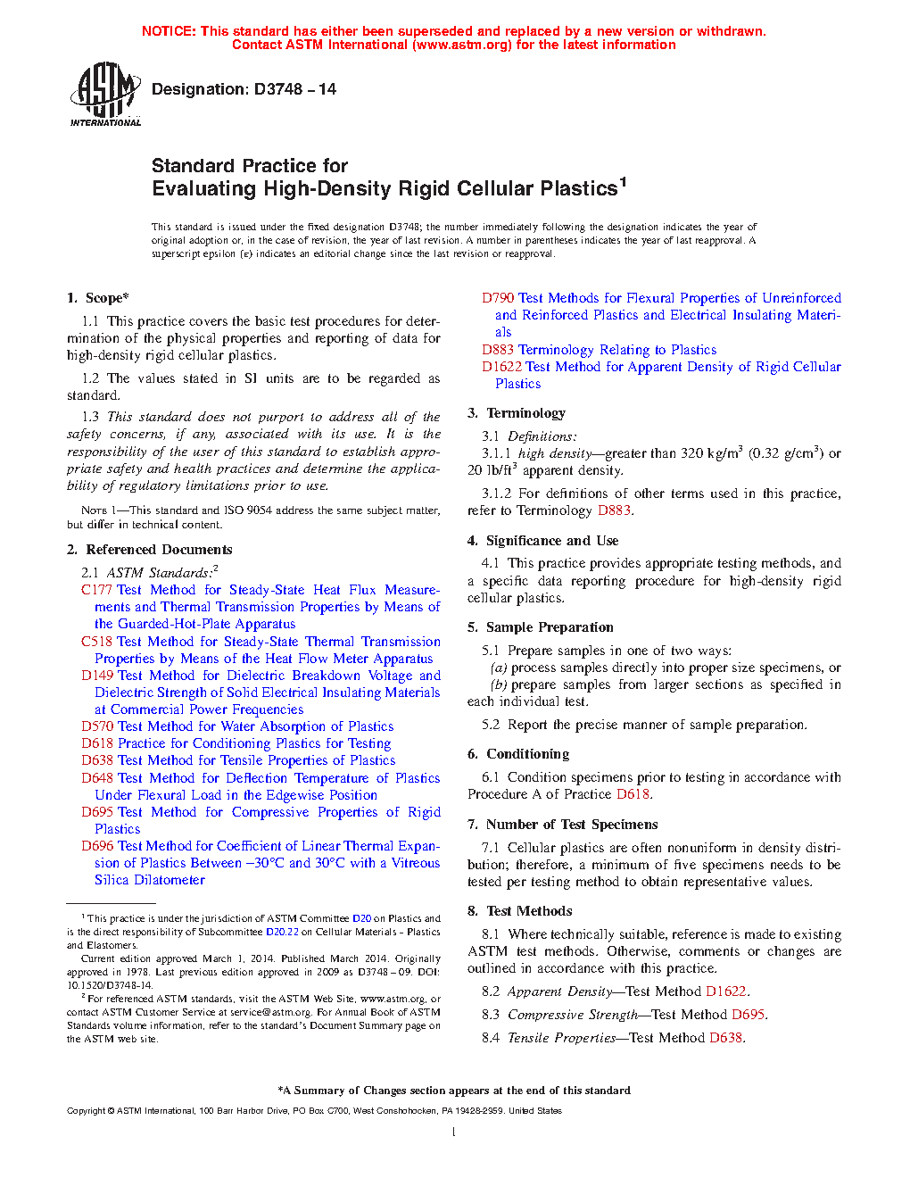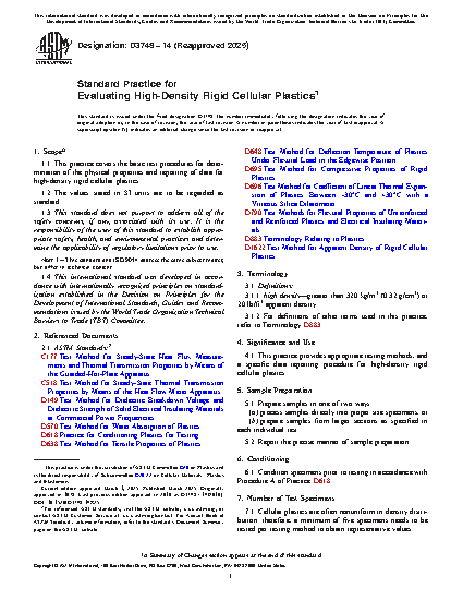 This practice covers the basic test procedures for the determination of the physical properties and the reporting of data for high-density rigid cellular plastics. Samples shall be prepared by either processing samples directly into proper size specimens, or by preparing samples from larger sections as specified in each individual test. Since cellular plastics are often nonuniform in density distribution, a minimum of five specimens shall, therefore, be tested per testing method to obtain representative values. The test methods covered here are to examine the following material properties: apparent density; compressive strength; tensile properties; coefficient of linear thermal expansion; apparent flexural properties; deflection temperature; dielectric breakdown voltage and dielectric strength; thermal conductivity; and water absorption rate.