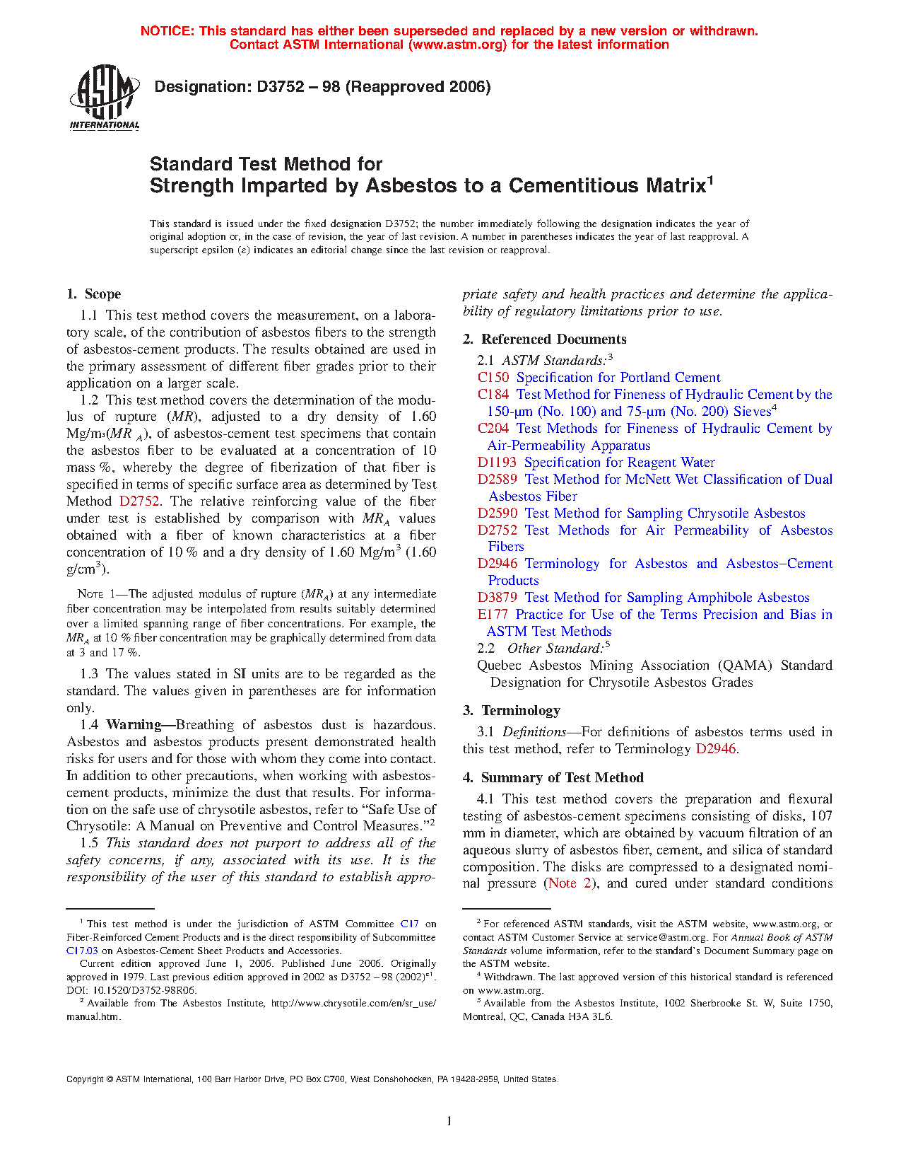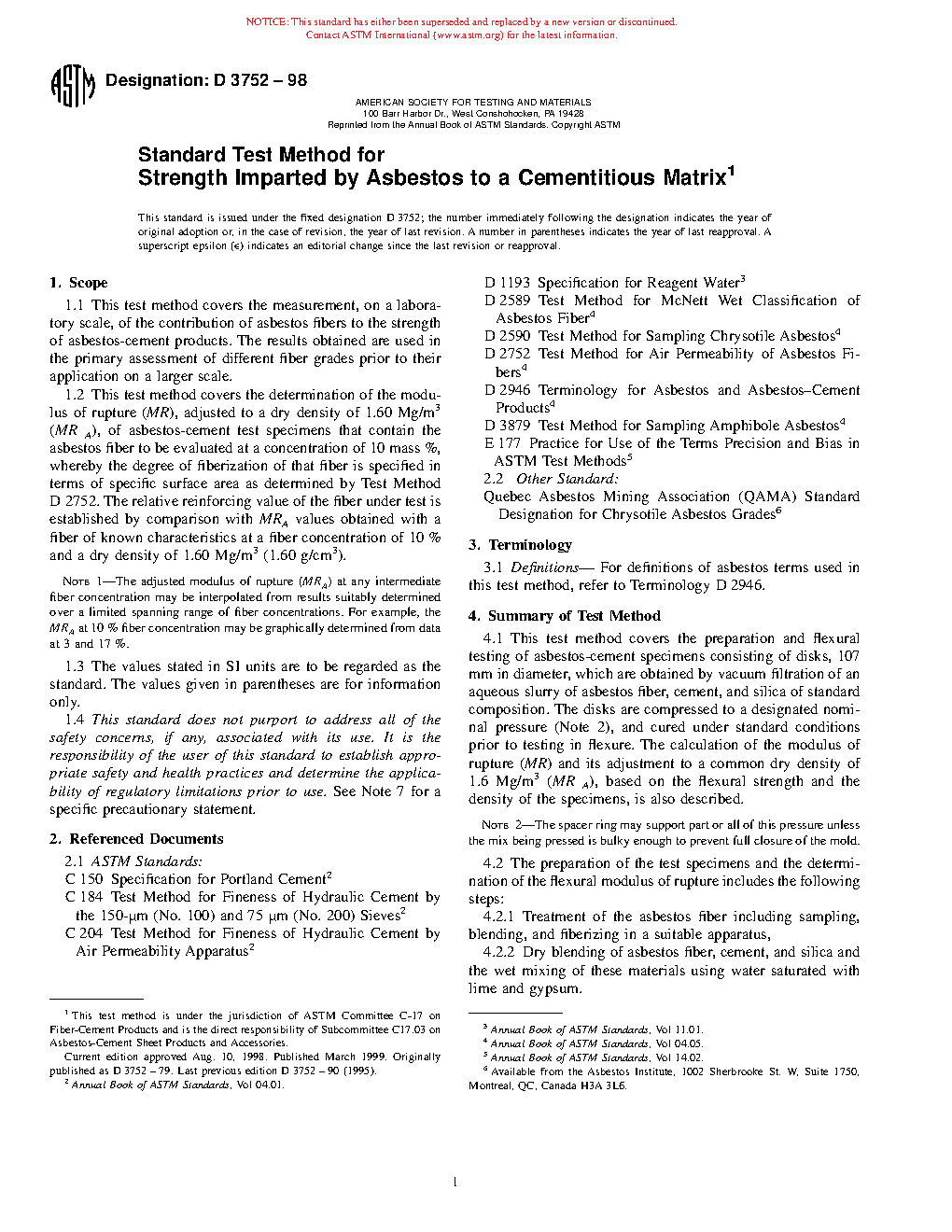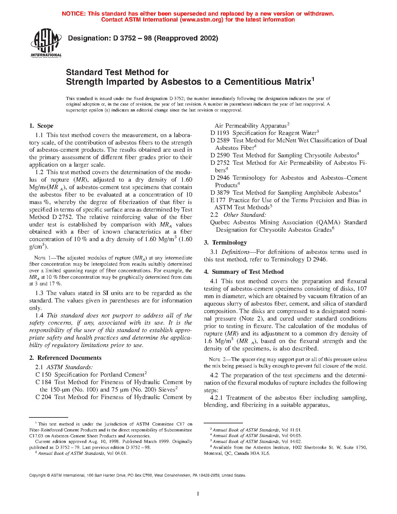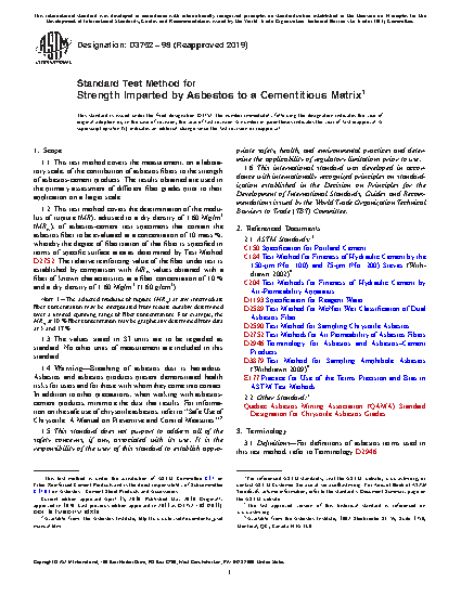 1.2 This test method covers the determination of the modulus of rupture (MR), adjusted to a dry density of 1.60 Mg/m3 (MR A), of asbestos-cement test specimens that contain the asbestos fiber to be evaluated at a concentration of 10 mass %, whereby the degree of fiberization of that fiber is specified in terms of specific surface area as determined by Test Method D 2752. The relative reinforcing value of the fiber under test is established by comparison with MRA values obtained with a fiber of known characteristics at a fiber concentration of 10 % and a dry density of 1.60 Mg/m3 (1.60 g/cm3).