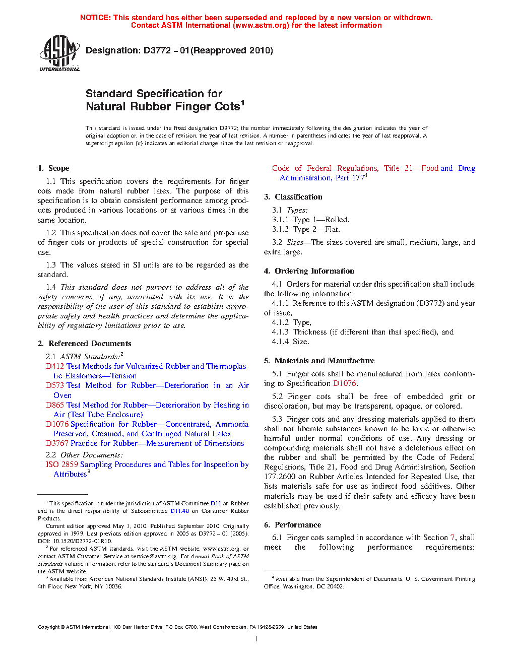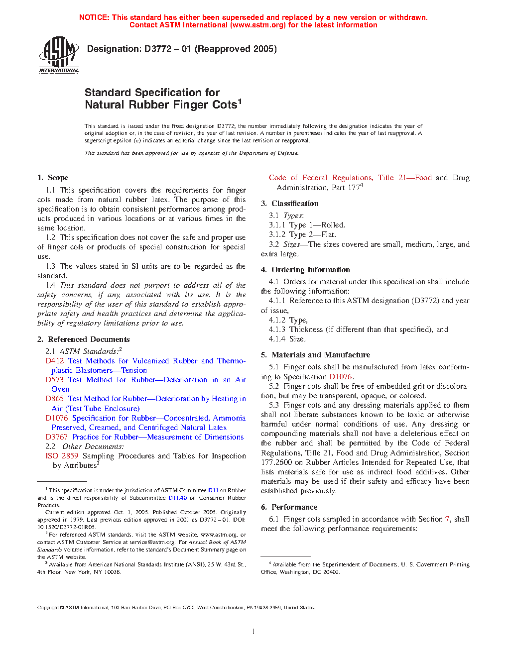 1.1 This specification covers the requirements for finger cots made from natural rubber latex. The purpose of this specification is to obtain consistent performance among products produced in various locations or at various times in the same location.