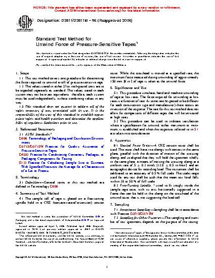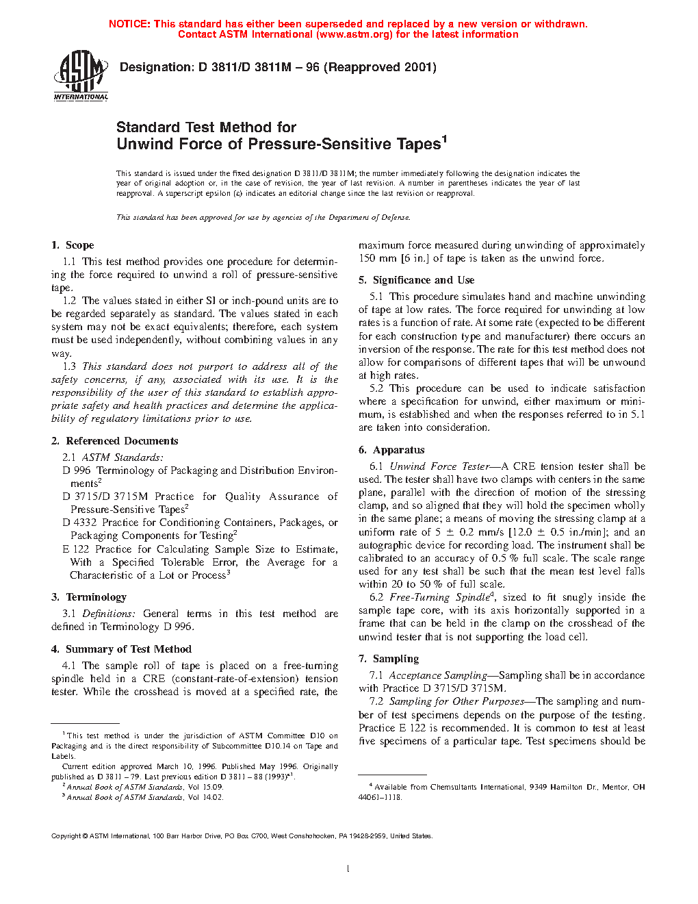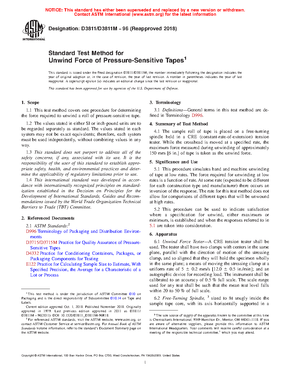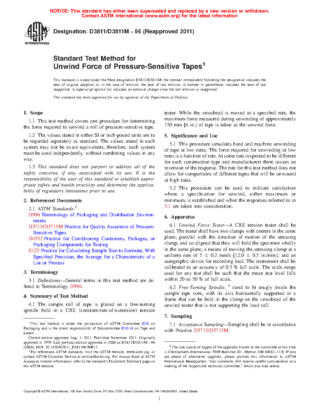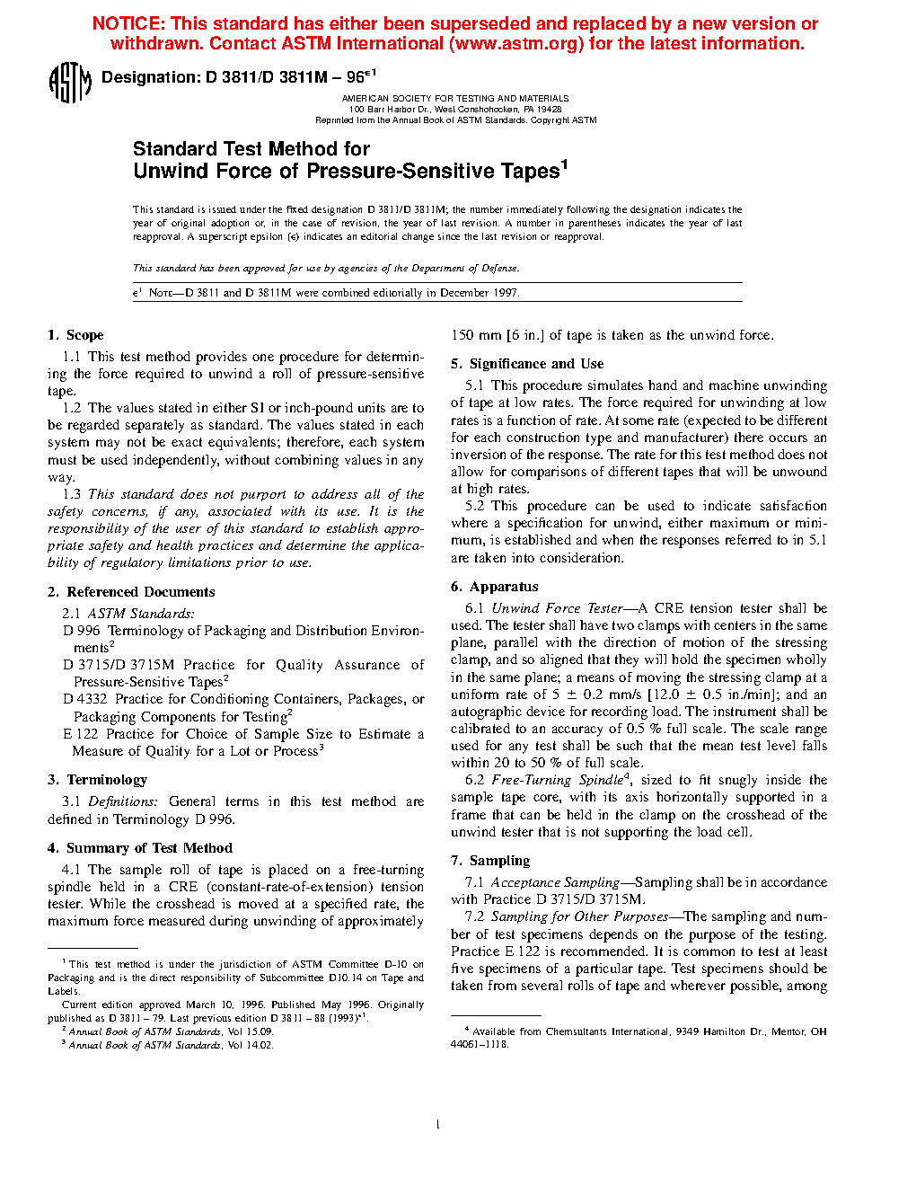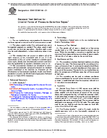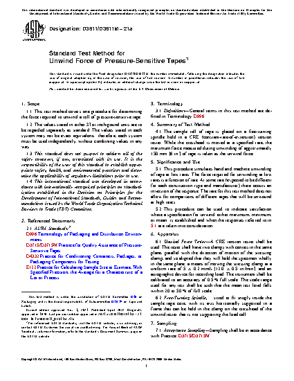 1.1 This test method covers one procedure for determining the force required to unwind a roll of pressure-sensitive tape.