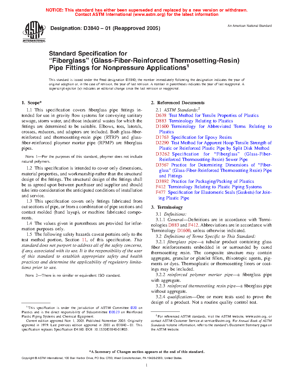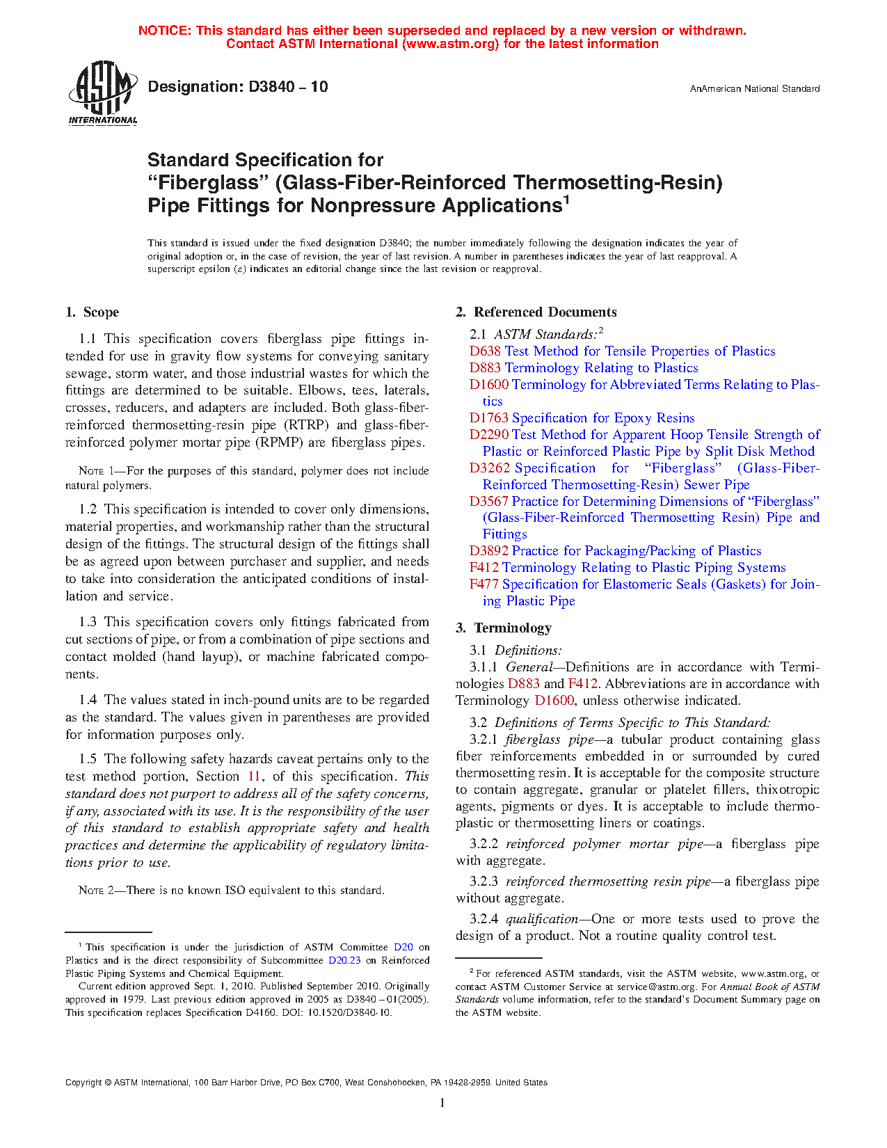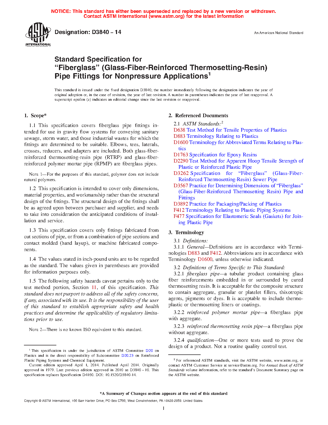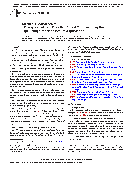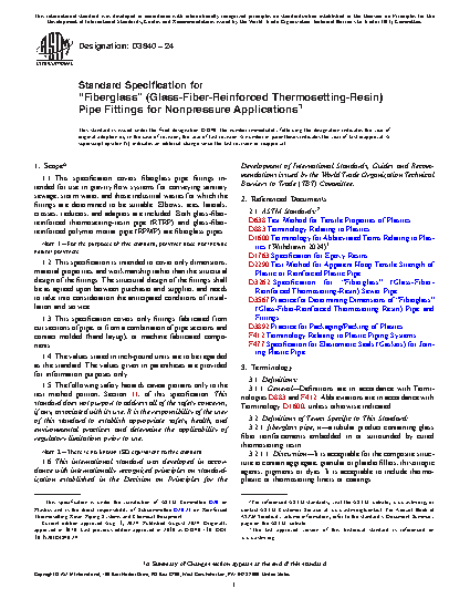 1.1 This specification covers fiberglass pipe fittings intended for use in gravity flow systems for conveying sanitary sewage, storm water, and those industrial wastes for which the fittings are determined to be suitable. Elbows, tees, laterals, crosses, reducers, and adapters are included. Both glass-fiber-reinforced thermosetting-resin pipe (RTRP) and glass-fiber-reinforced polymer mortar pipe (RPMP) are fiberglass pipes.