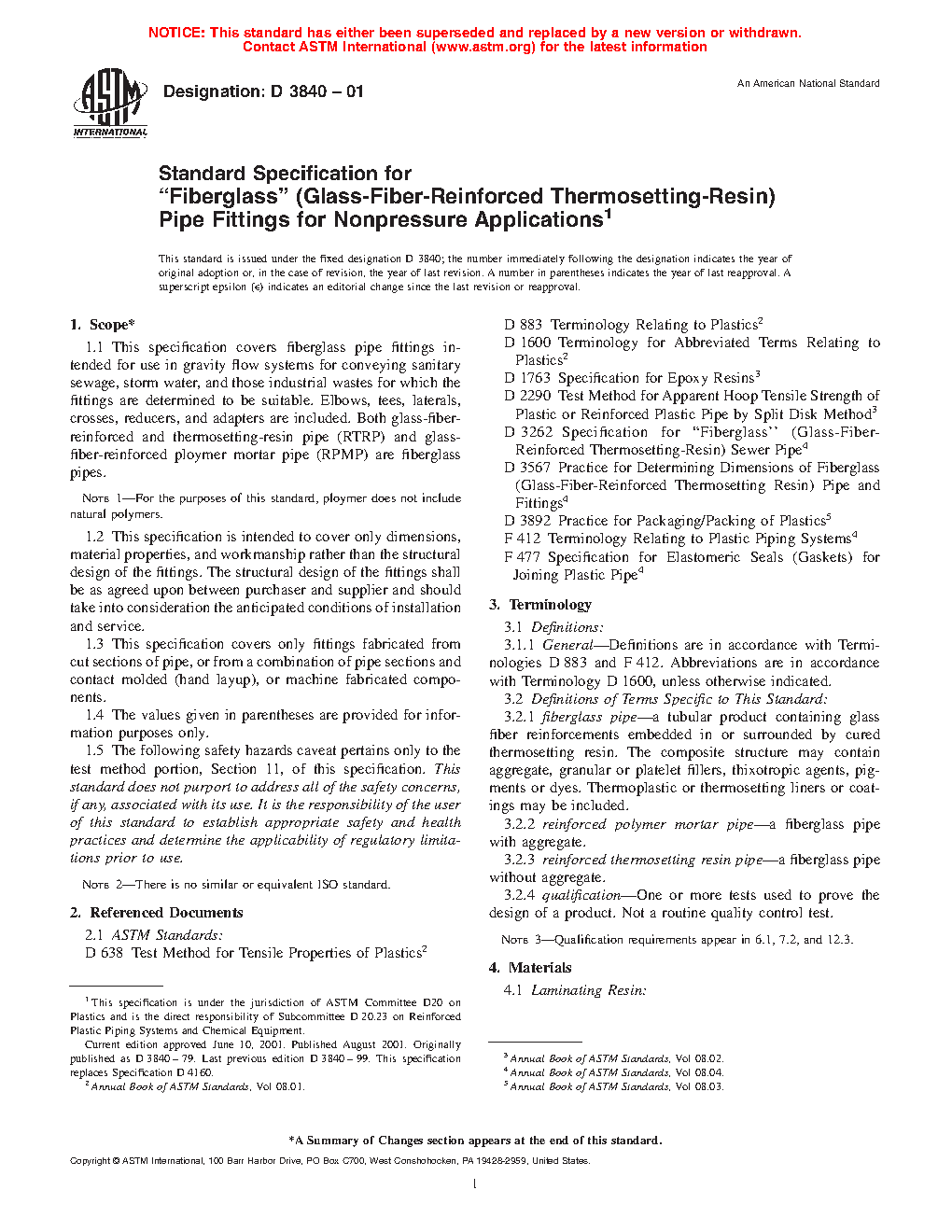 This specification covers fiberglass pipe fittings intended for use in gravity flow systems for conveying sanitary sewage, storm water, and those industrial wastes for which the fittings are determined to be suitable. Laminating resins shall be classified as Types 1 and 2. Reinforcements shall be classified as Grades 1 and 2. Ultimate tensile strength; maximum shear strength; and dimension tests shall be performed to conform the requirements specified.