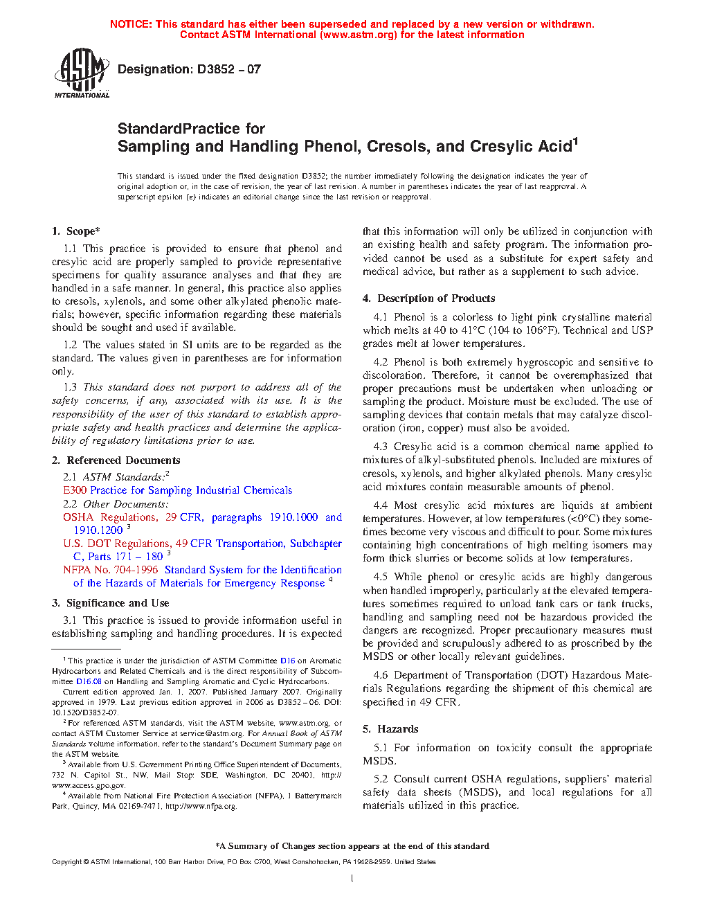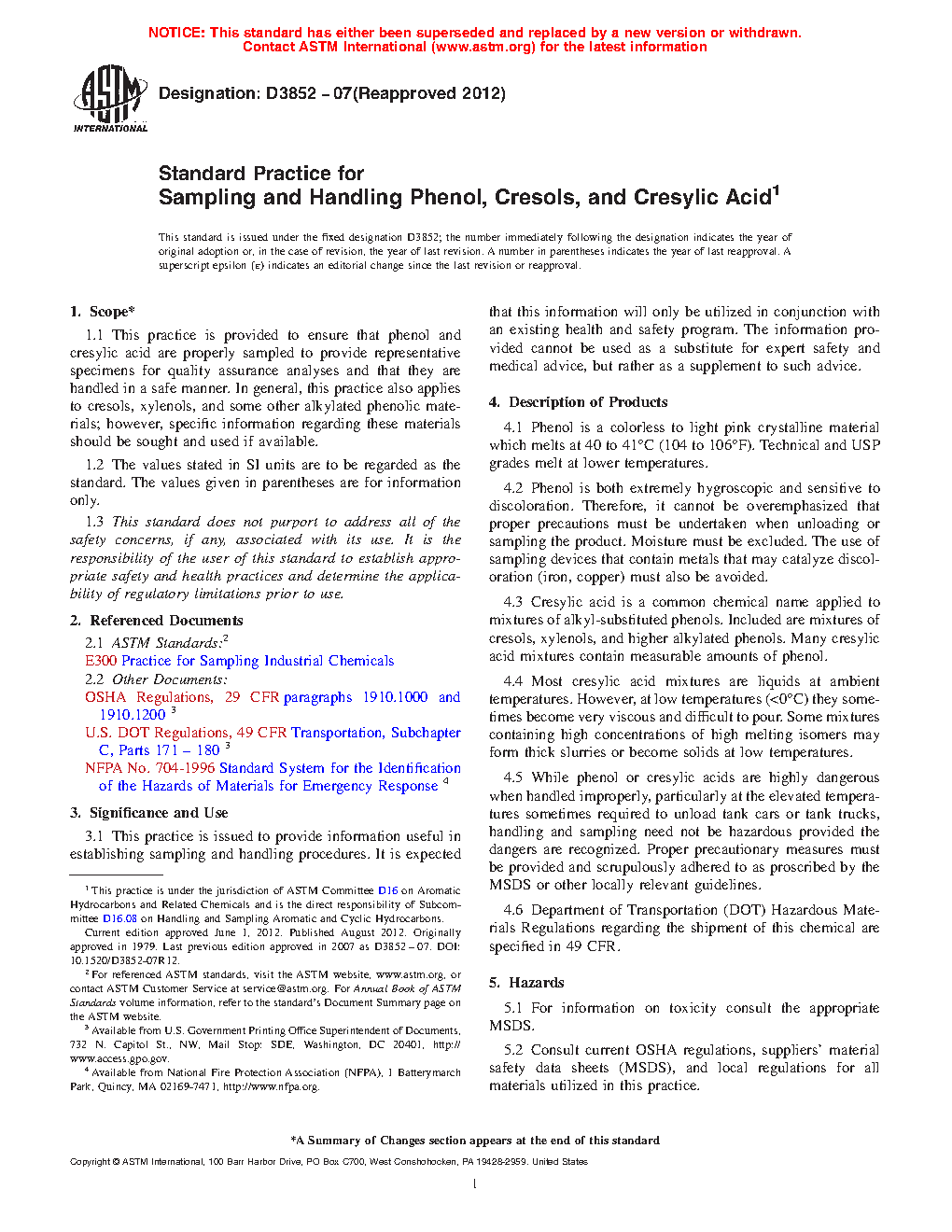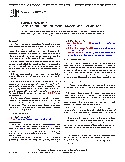 1.1 This practice covers procedures for sampling and handling phenol, cresols and cresylic acid in solid and liquid forms, including liquids at elevated temperatures, in a safe manner that represents and preserves quality. In general, this practice also applies to xylenols, and some other alkylated phenolic materials; however, specific information regarding these materials should be sought and used if available.