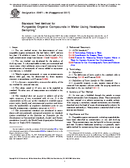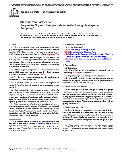 1.1 This test method covers the determination of most purgeable organic compounds that boil below 200°C and are less than 2 % soluble in water. It covers the low μg/L to low mg/L concentration range (see Section 15 and Appendix X1).