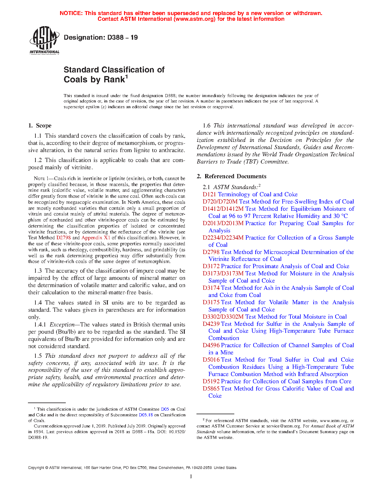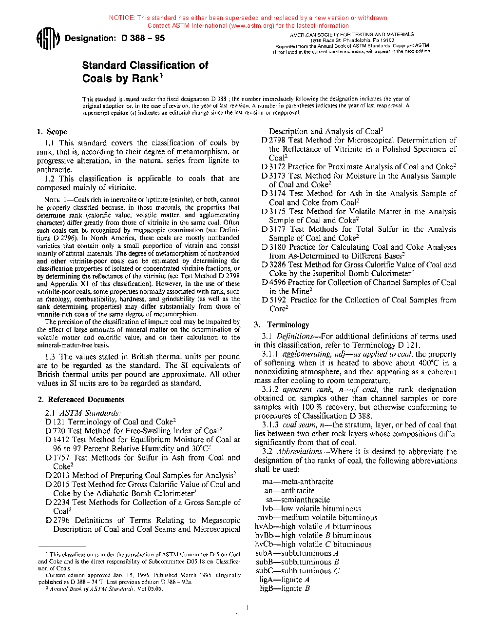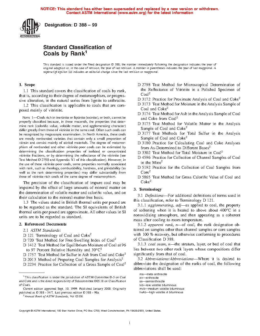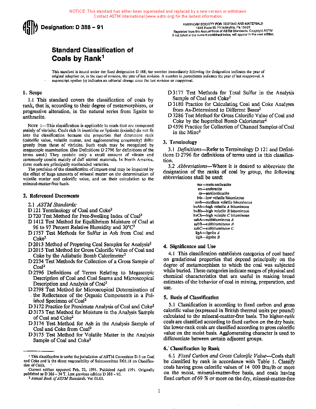 This specification covers the classification of coals by rank, that is, according to their degree of metamorphism, or progressive alteration, in the natural series from lignite to anthracite. These coals are mainly composed of vitrinite. The classification shall be based on gradational properties that depend on the degree of metamorphism. The classification shall also be according to fixed carbon and gross calorific value calculated to the mineral-matter-free basis.