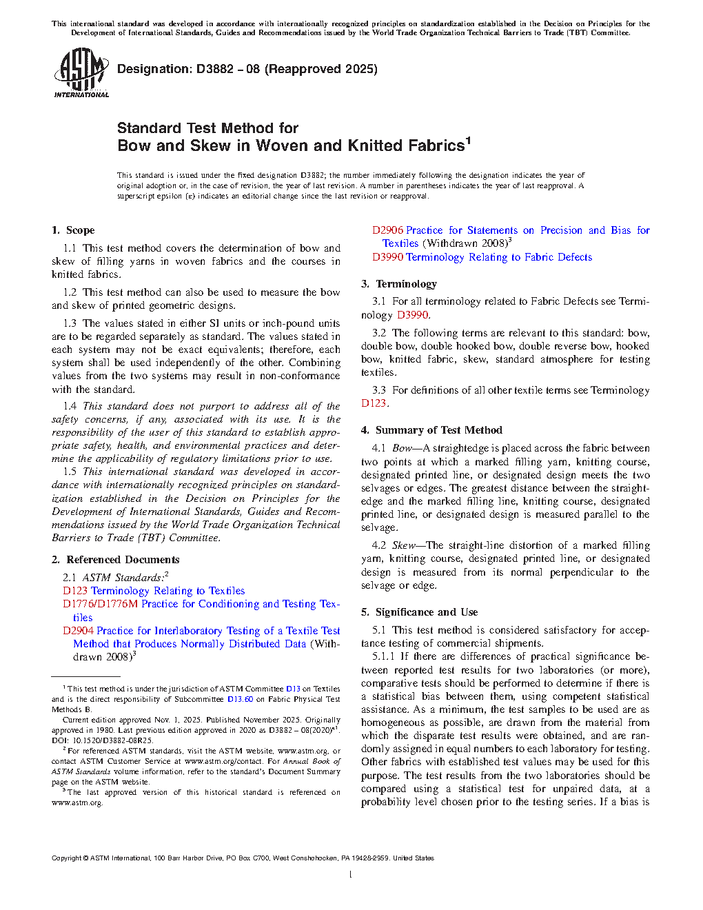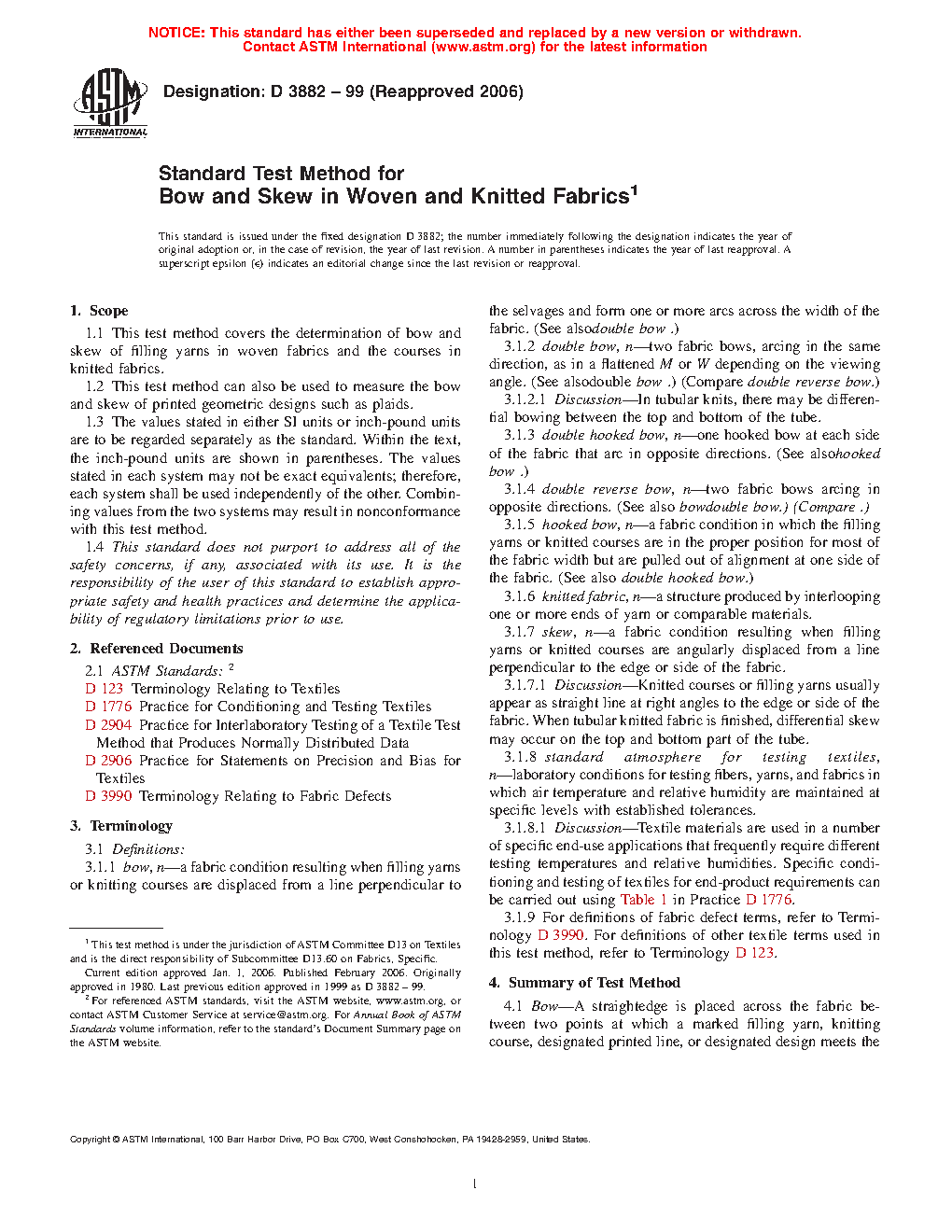 1.1 This test method covers the determination of bow and skew of filling yarns in woven fabrics and the courses in knitted fabrics.