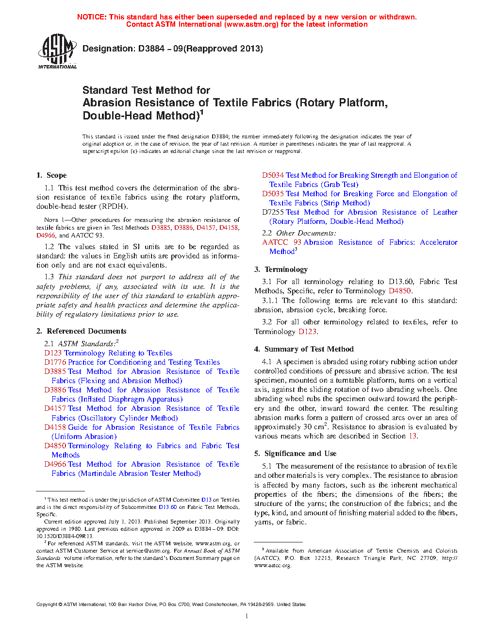 Note 1—Other procedures for measuring the abrasion resistance of textile fabrics are given in Test Methods D 3885, D 3886, D 1775, D 4158, D 4966, and AATCC 61.