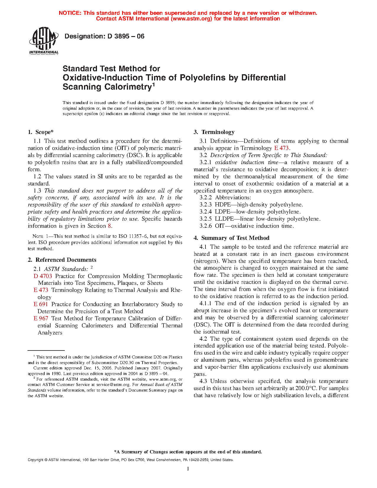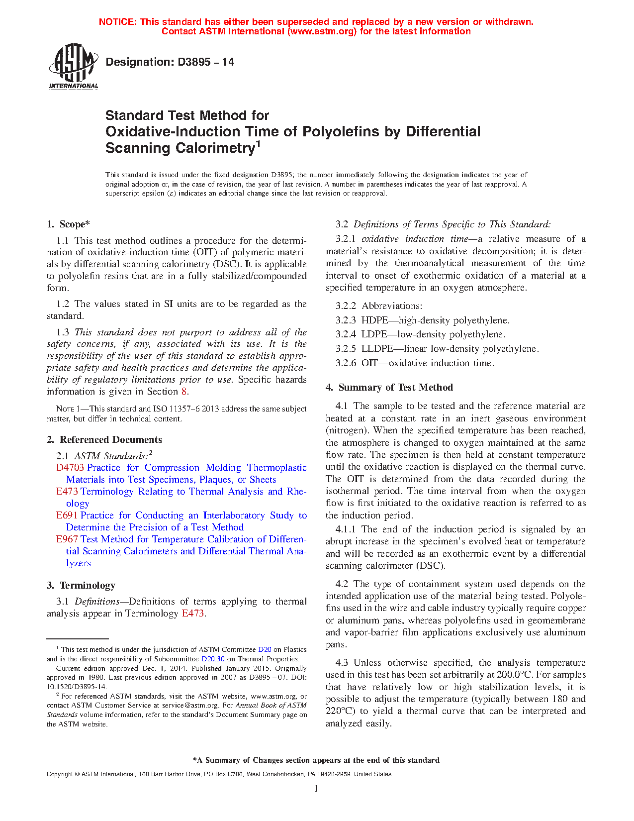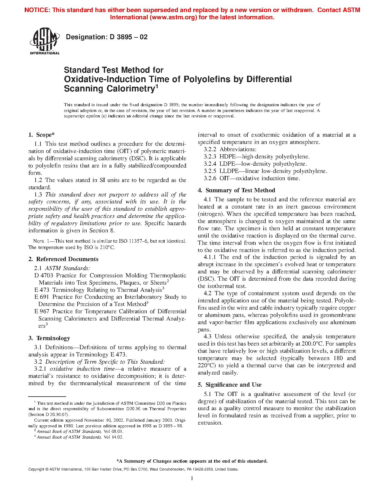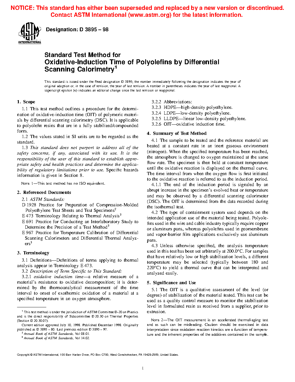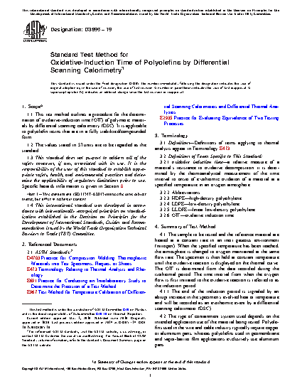 1.1 This test method outlines a procedure for the determination of oxidative-induction time (OIT) of polymeric materials by differential scanning calorimetry (DSC). It is applicable to polyolefin resins that are in a fully stabilized/compounded form.