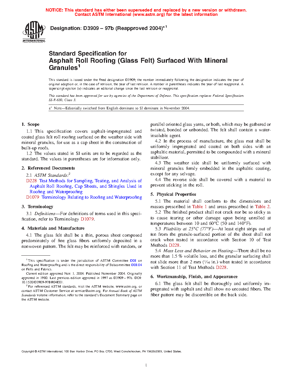 1.1 This specification covers asphalt-impregnated and coated glass felt roll roofing surfaced on the weather side with mineral granules, for use as a cap sheet in the construction of built-up roofs.