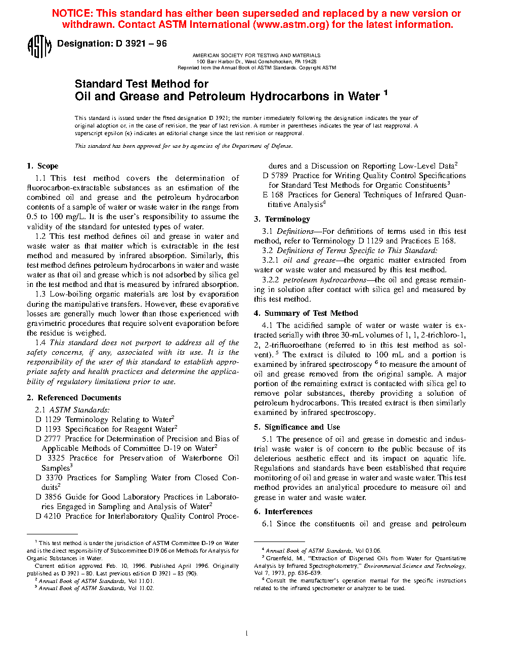 1.2 This test method defines oil and grease in water and waste water as that matter which is extractable in the test method and measured by infrared absorption. Similarly, this test method defines petroleum hydrocarbons in water and waste water as that oil and grease which is not adsorbed by silica gel in the test method and that is measured by infrared absorption.