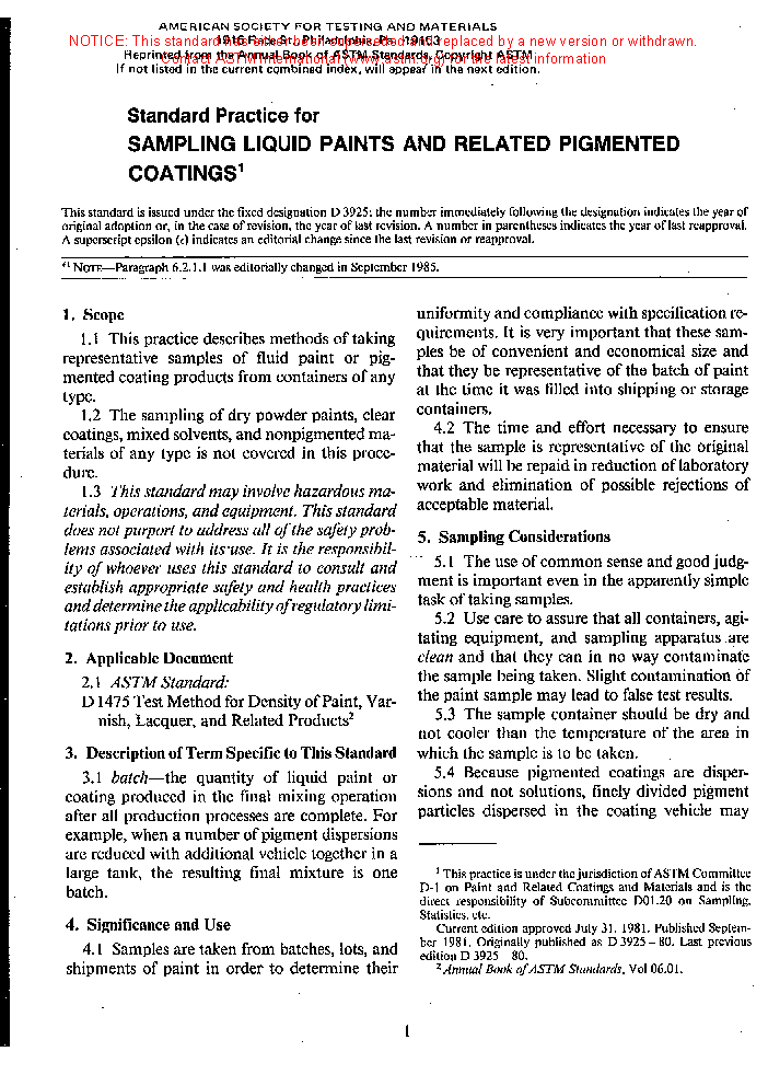 1.1 This practice describes methods of taking representative samples of fluid paint or pigmented coating products from containers of any type.