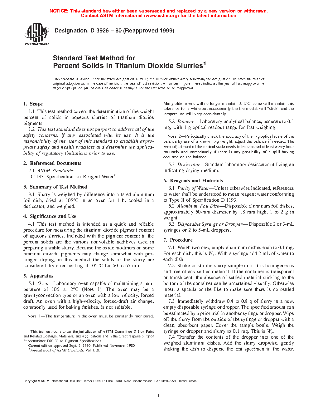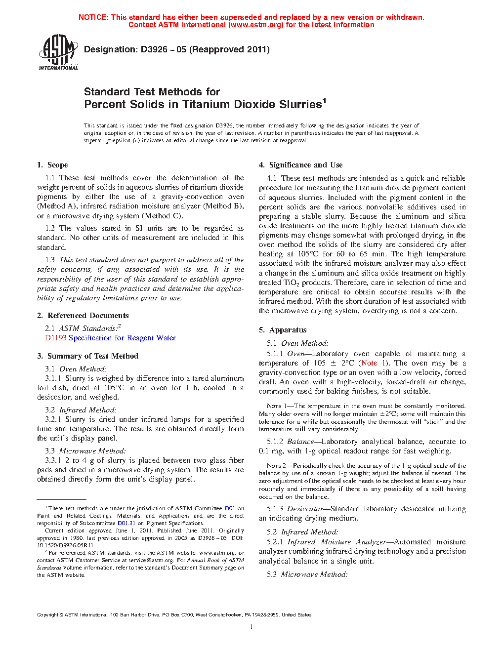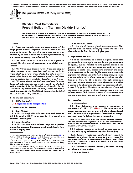1.1 These test methods cover the determination of the weight percent of solids in aqueous slurries of titanium dioxide pigments by either the use of a gravity-convection oven (Method A), infrared radiation moisture analyzer (Method B), or a microwave drying system (Method C).