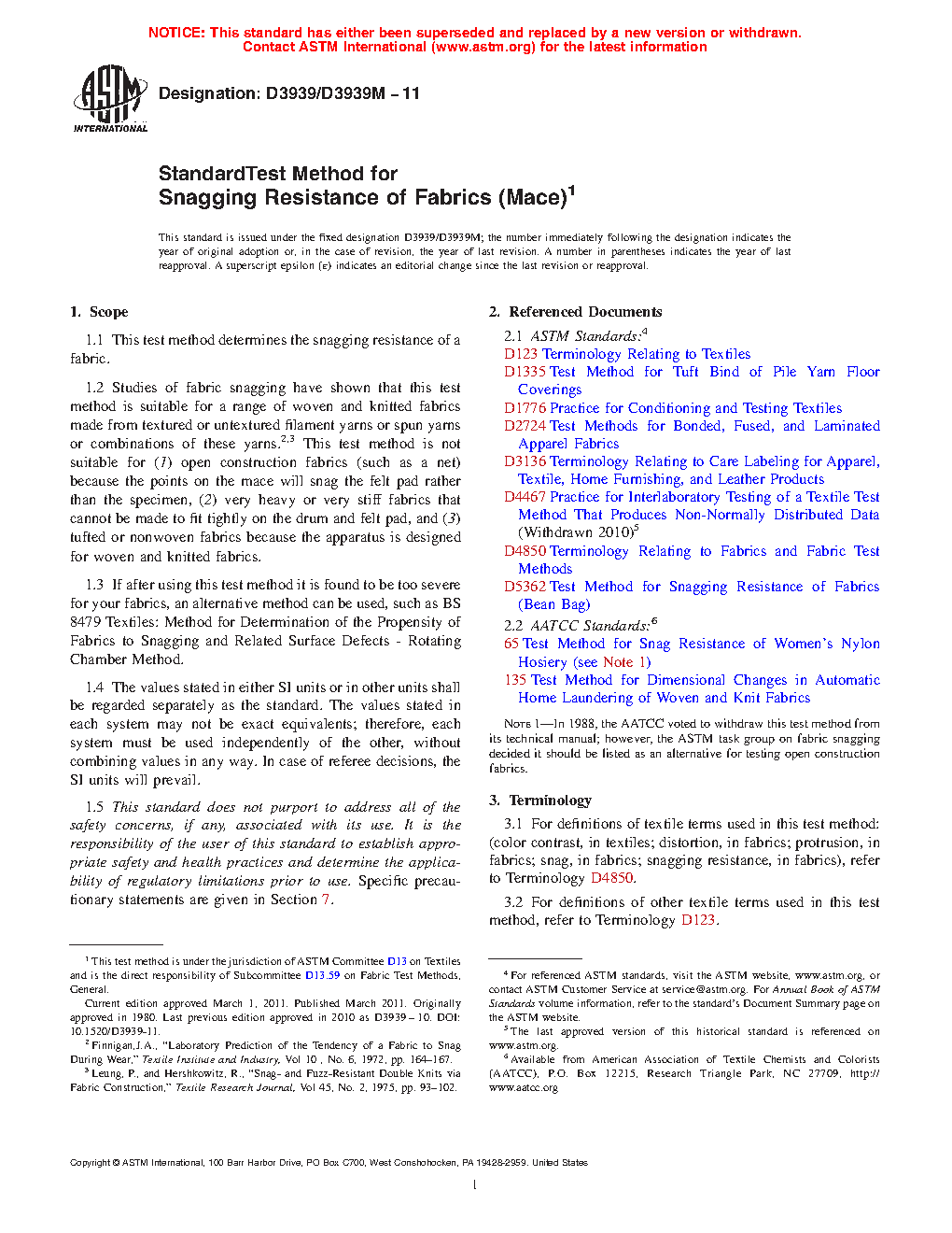 1.2 Studies of fabric snagging have shown that this test method is suitable for a range of woven and knitted fabrics made from textured or untextured filament yarns or spun yarns or combinations of these yarns.2,3 This test method is not suitable for (1) open construction fabrics (such as a net) because the points on the mace will snag the felt pad rather than the specimen, (2) very heavy or very stiff fabrics that cannot be made to fit tightly on the drum and felt pad, and (3) tufted or nonwoven fabrics because the apparatus is designed for woven and knitted fabrics.