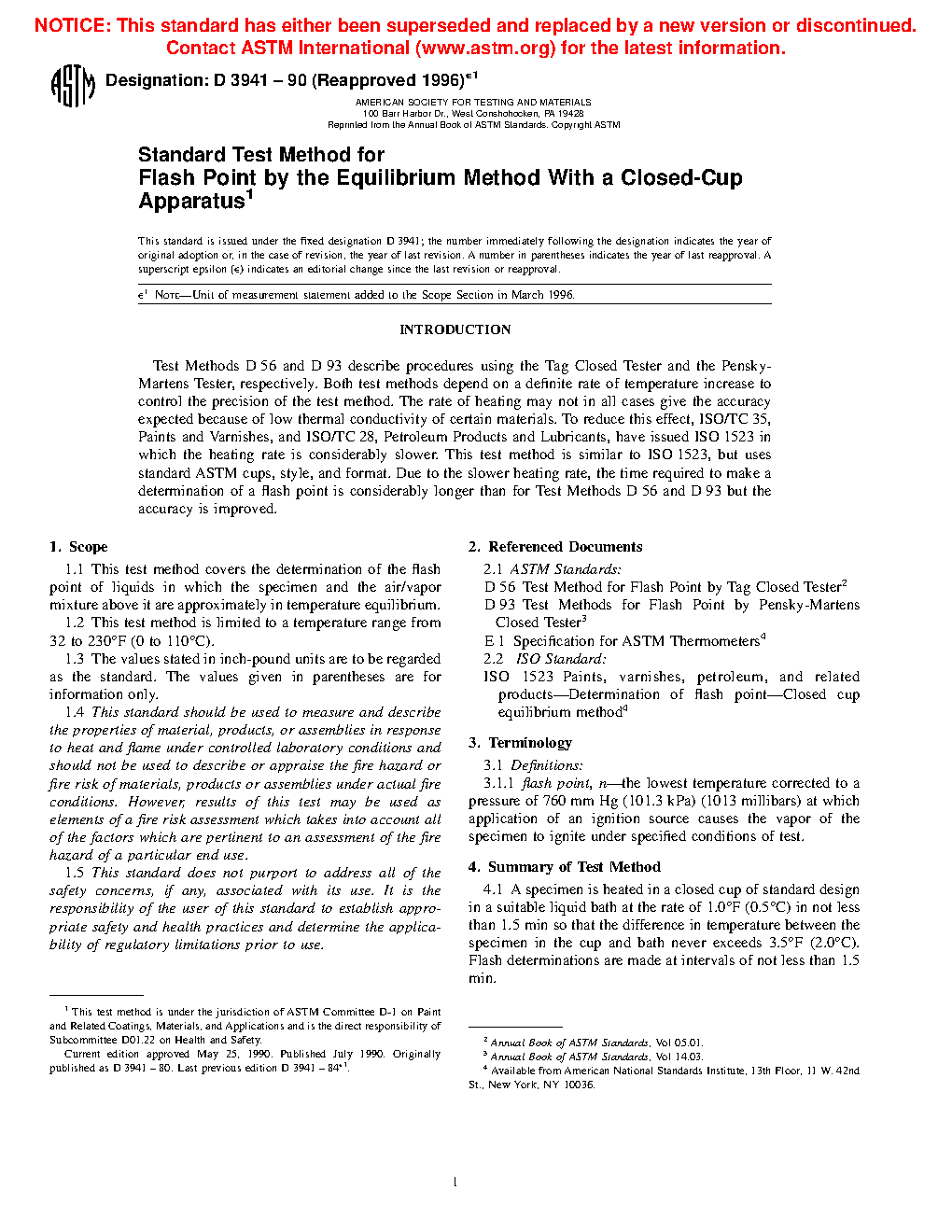 Note 1—ISO 1523 is used in United Nations Recommendations for Transportation of Dangerous Goods and in the International Civil Aviation Organization (ICAO) regulations and for similar regulations in the International Maritime Dangerous Goods (IMDG) code. Test Method D 3941, which is similar to ISO 1523, is used in the United States Department of Transportation (USDOT) regulations. The ICAO and IMDG codes are used for transshipment of hazardous materials through the United States to other countries.