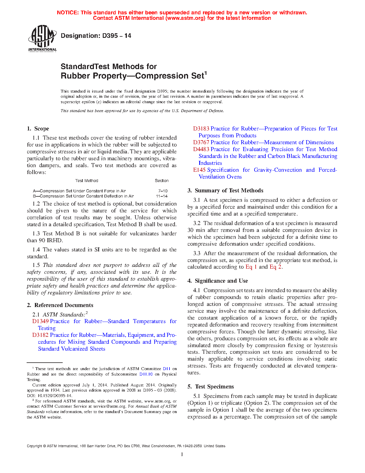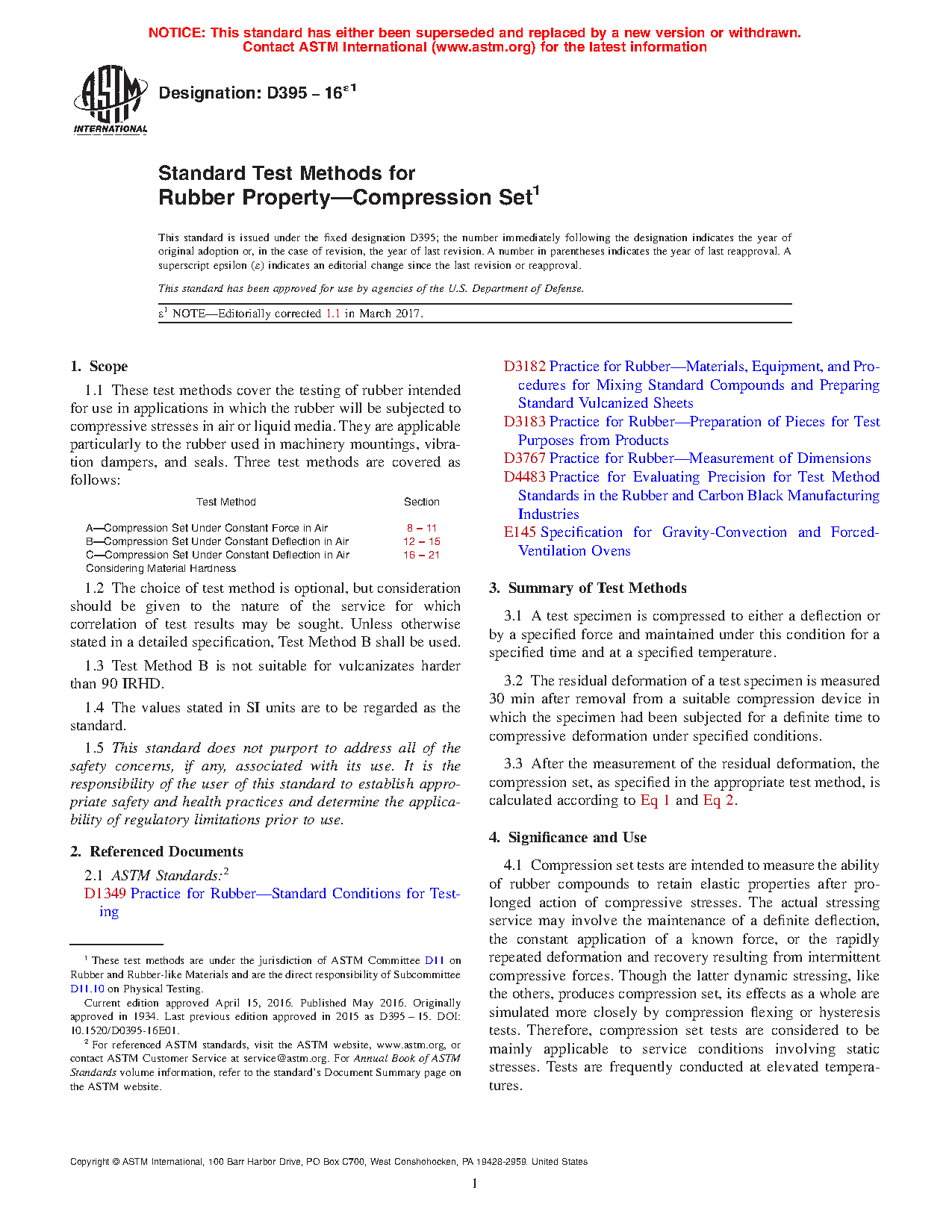 1.1 These test methods cover the testing of rubber intended for use in applications in which the rubber will be subjected to compressive stresses in air or liquid media. They are applicable particularly to the rubber used in machinery mountings, vibration dampers, and seals. Three test methods are covered as follows: