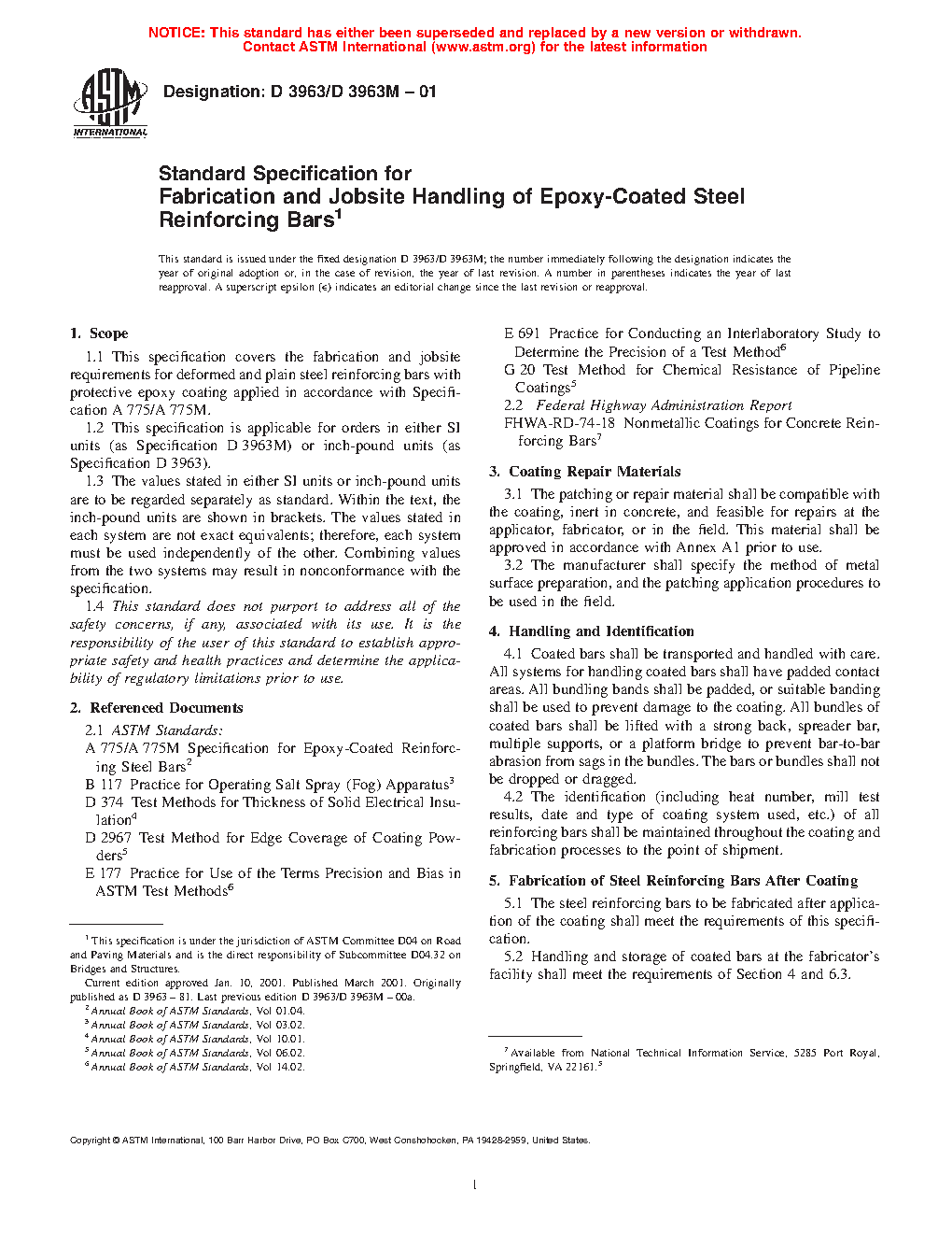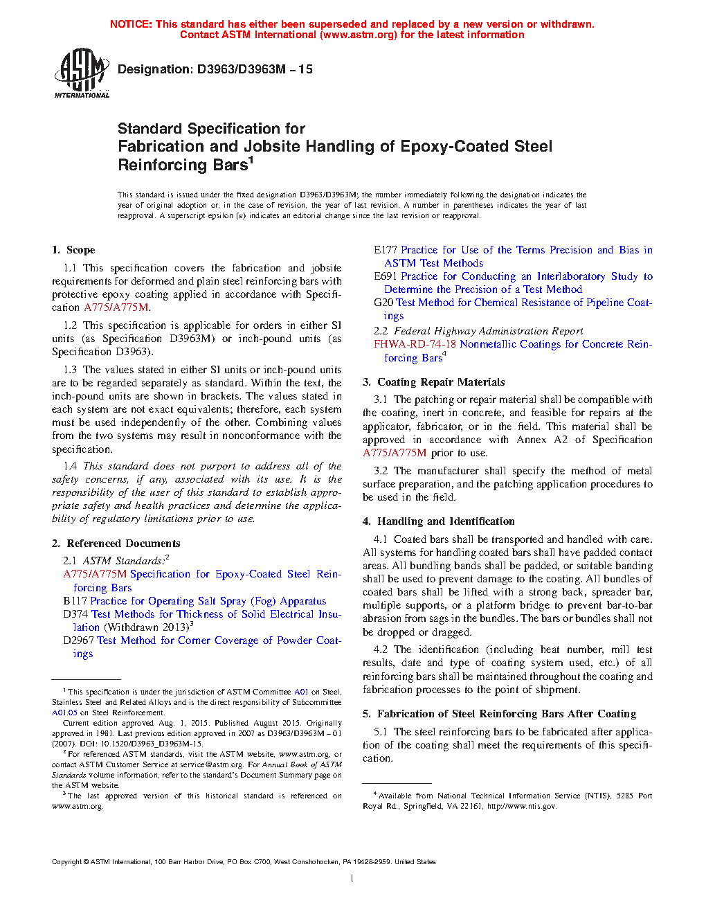 This specification covers the fabrication and jobsite requirements for deformed and plain steel reinforcing bars with protective epoxy coating. The fabrication of steel reinforcing bars after coating shall meet the requirements prescribed. The storage, handling and placement at the jobsite of epoxy-coated steel reinforcing bars shall meet the requirements prescribed. The repair method of damage incurred during fabrication and incurred during shipment and handling at the job sites shall meet the requirements prescribed.