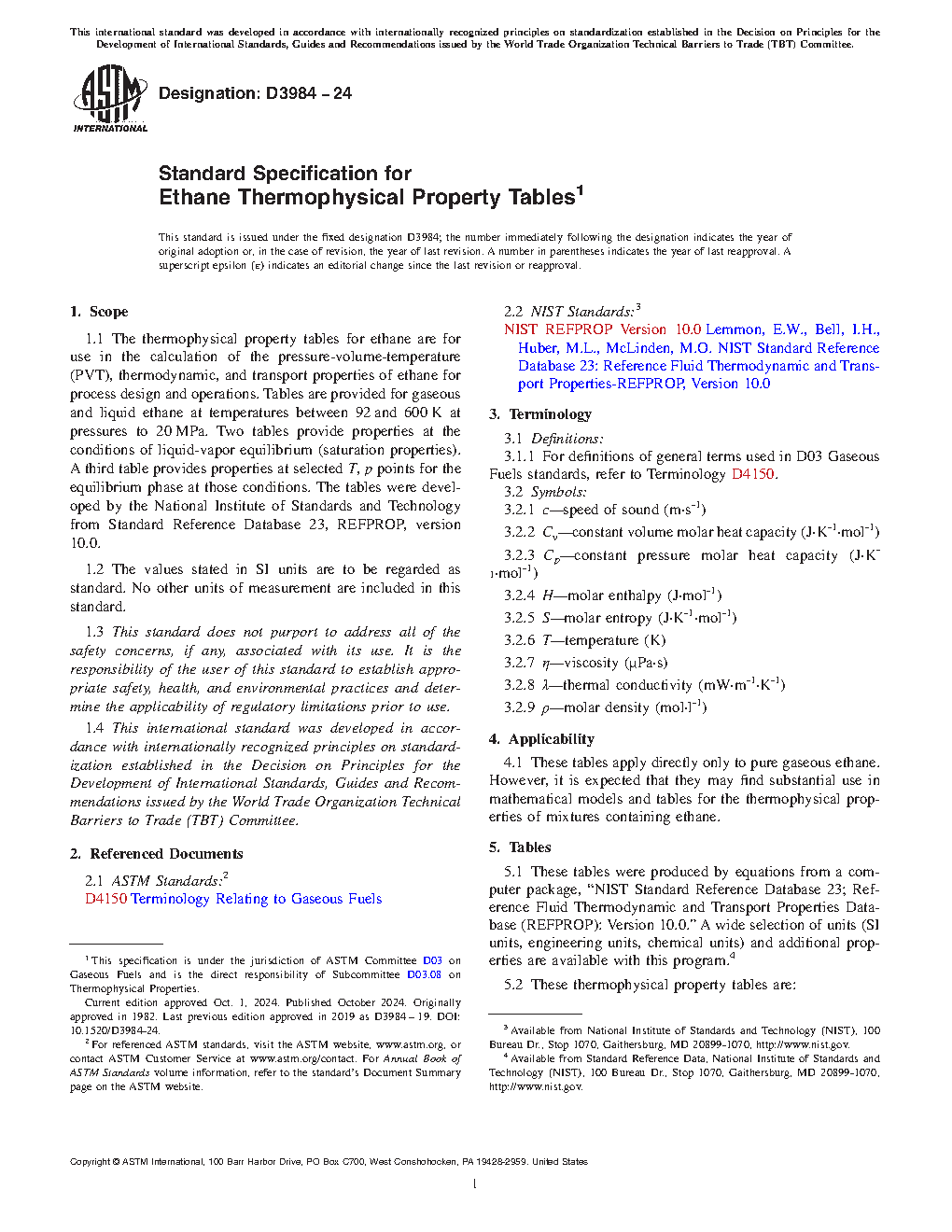 1.1 The thermophysical property tables for ethane are for use in the calculation of the pressure-volume-temperature (PVT), thermodynamic, and transport properties of ethane for process design and operations. Tables are provided for gaseous and liquid ethane at temperatures between 92 and 600 K at pressures to 20 MPa. Two tables provide properties at the conditions of liquid-vapor equilibrium (saturation properties). A third table provides properties at selected T, p points for the equilibrium phase at those conditions. The tables were developed by the National Institute of Standards and Technology from Standard Reference Database 23, REFPROP, version 10.0.